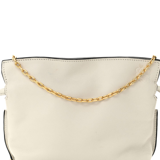 This is an authentic LOEWE Calfskin Nano Flamenco Knot Clutch in Soft White. This mini bag is crafted of smooth calfskin leather in white. It features a removable chain strap and a knotted drawstring top. This opens to a brown suede interior.