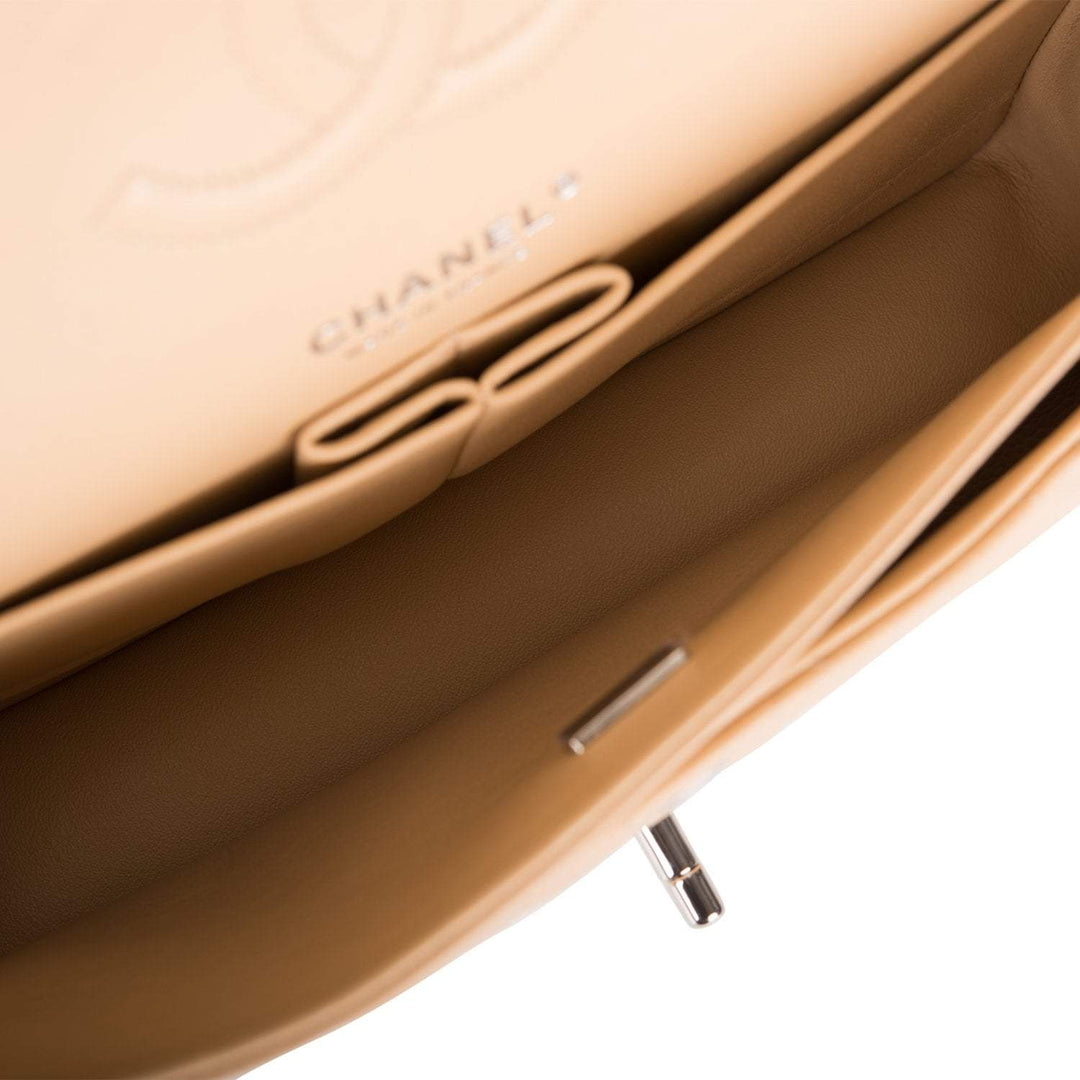 This Medium Classic Double Flap bag is in beige caviar leather with silver tone hardware and features a front flap with signature CC turnlock closure, half moon back pocket, and adjustable interwoven silver tone chain link and beige leather shoulder strap.