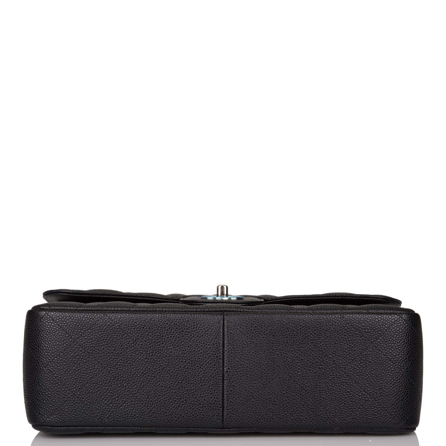 This Jumbo Classic Double Flap bag is in black caviar leather with silver tone hardware and features a front flap with signature CC turnlock closure, half moon back pocket, and adjustable interwoven silver tone chain link and black leather shoulder strap.