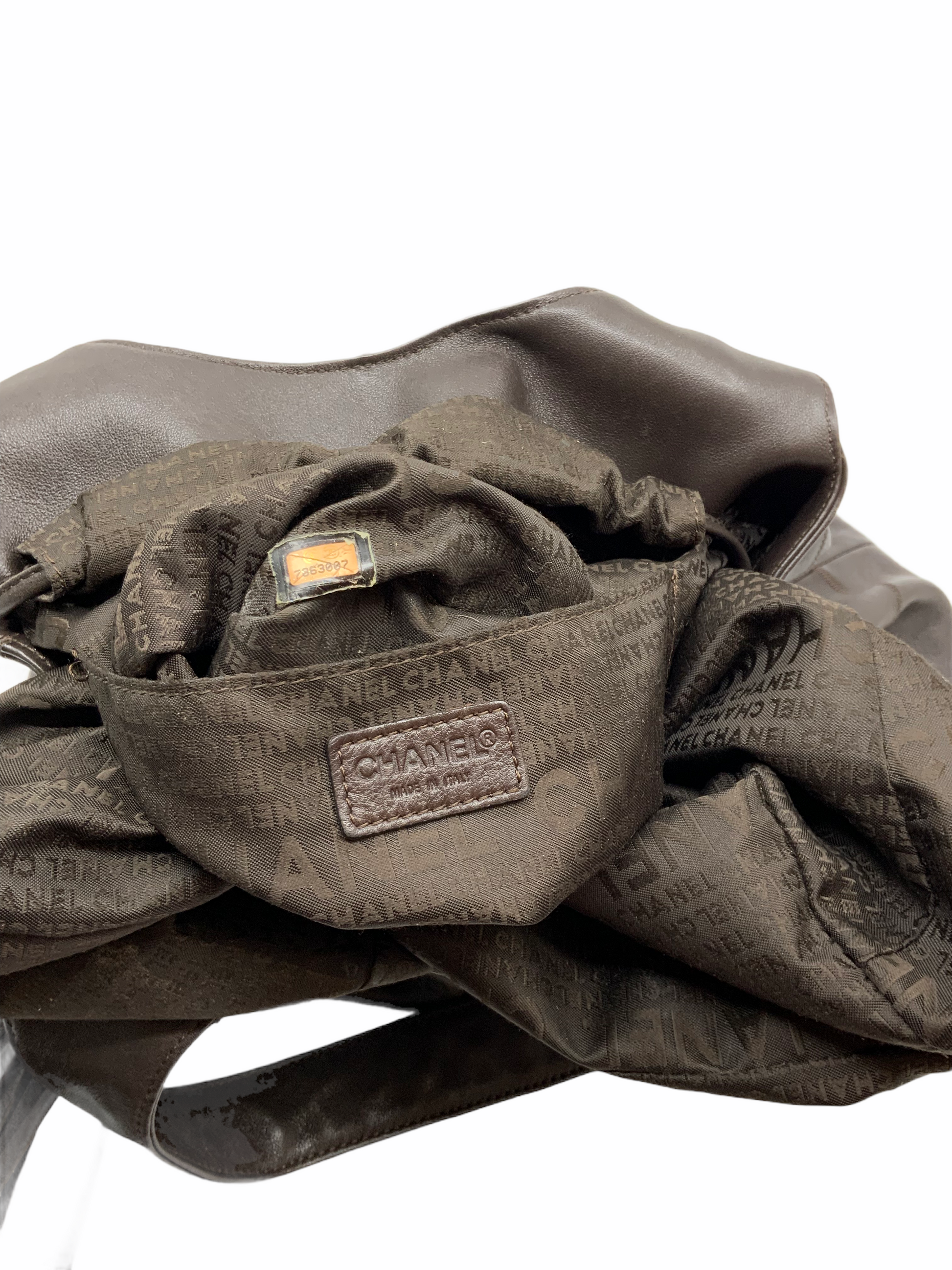 CHANEL Calfskin Square Stitched Tassel Hobo which makes for the perfect everyday carry-all. Beautifully crafted from chocolate brown square quilted calfskin leather and silver-tone hardware. Featuring dual flat leather looping shoulder straps and a signature ‘CC’ logo-engraved cinch drawstring tassel closure.