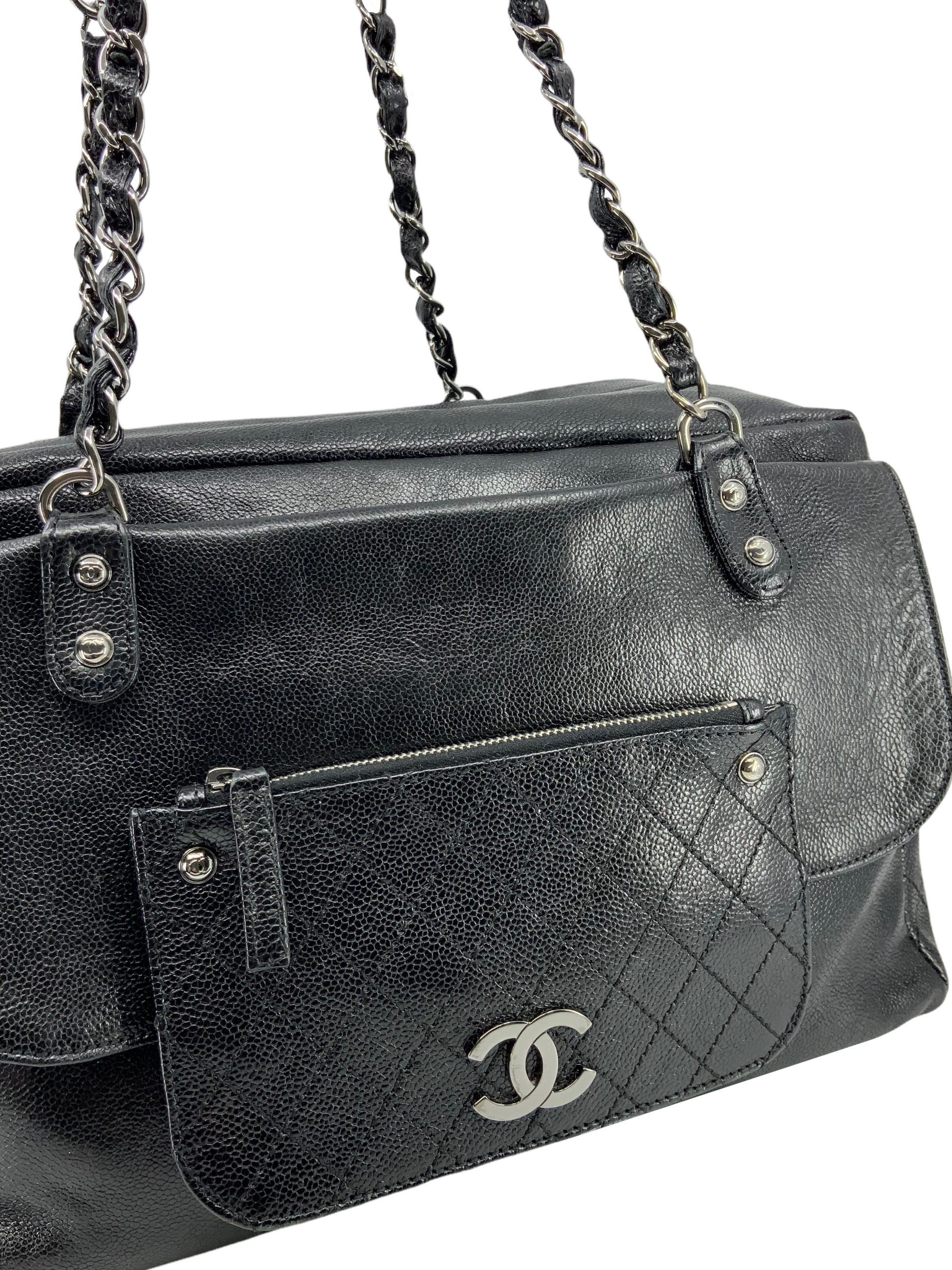 We guarantee the authenticity of this CHANEL Caviar Pocket In the City Shoulder Bag, part of Chanel’s classic caviar collection which continually increases in value. Featuring multiple functional exterior compartments, silver-tone hardware, including four protective metal feet, a signature ‘CC’ logo at front and chain link straps with comfortable quilted leather shoulder pads.