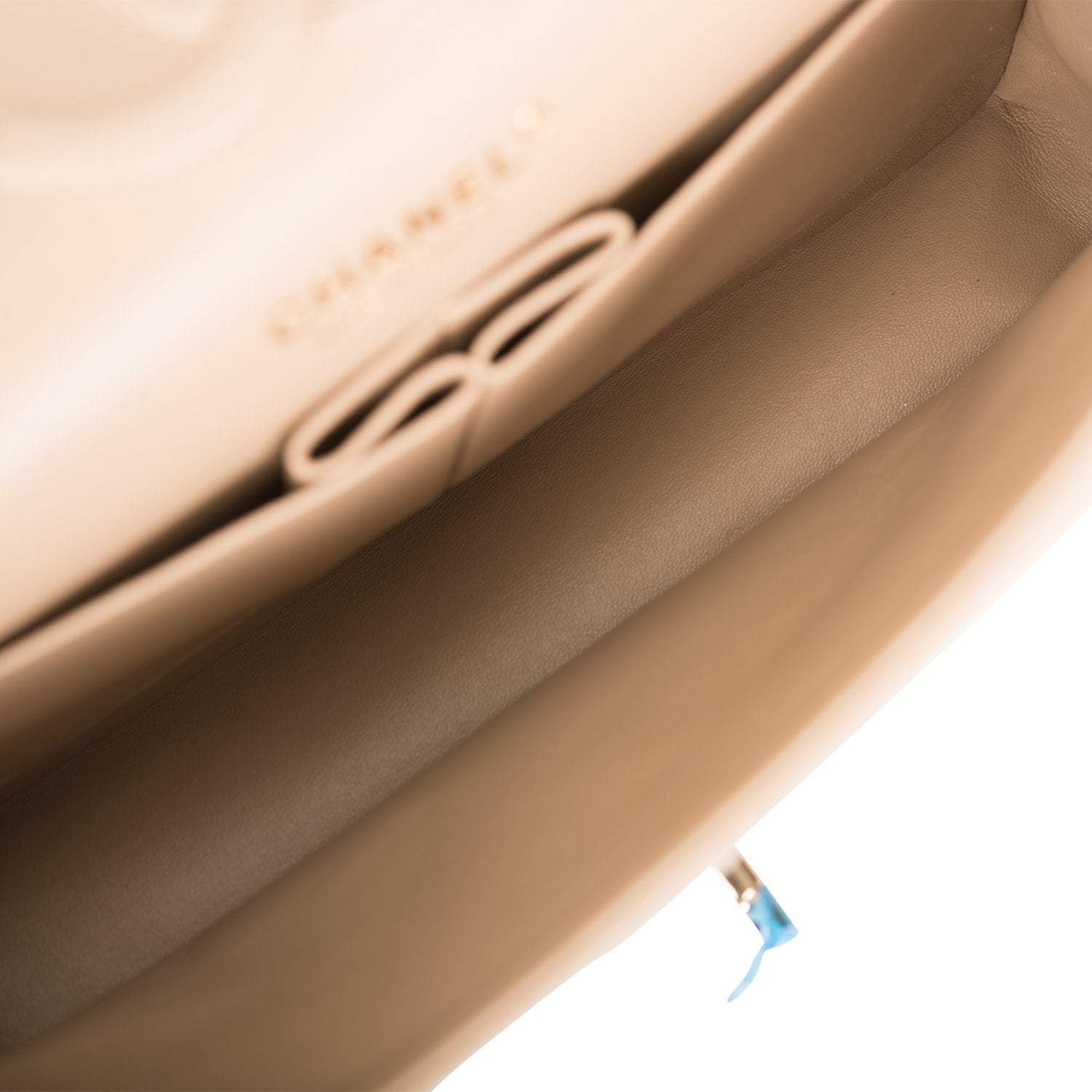 The interior is lined in beige leather with the “love letter” zipper compartment underneath the first flap, an “outer” slit pocket under the second flap, and an interior compartment with two open pockets separated by a “lipstick” compartment.