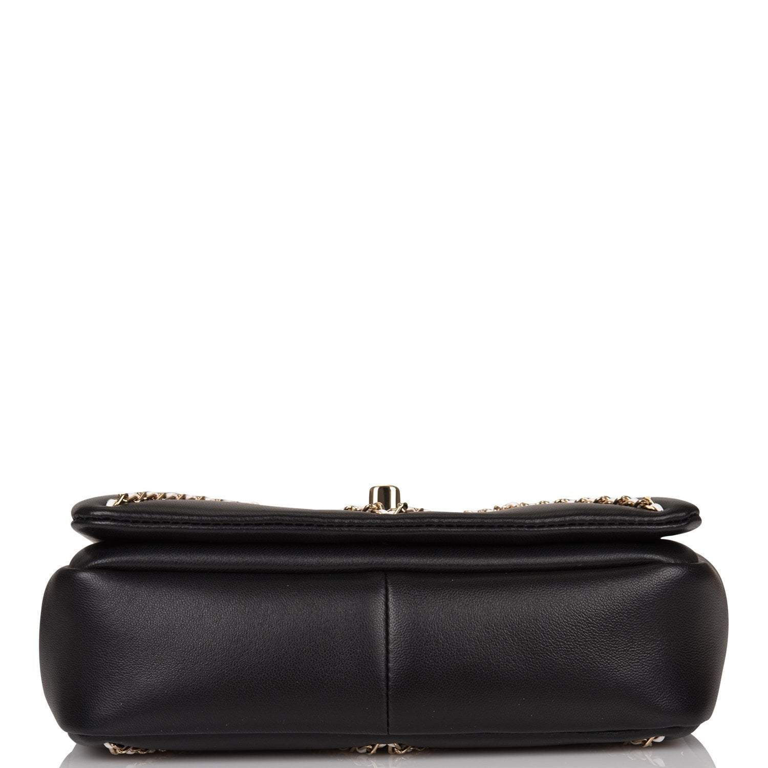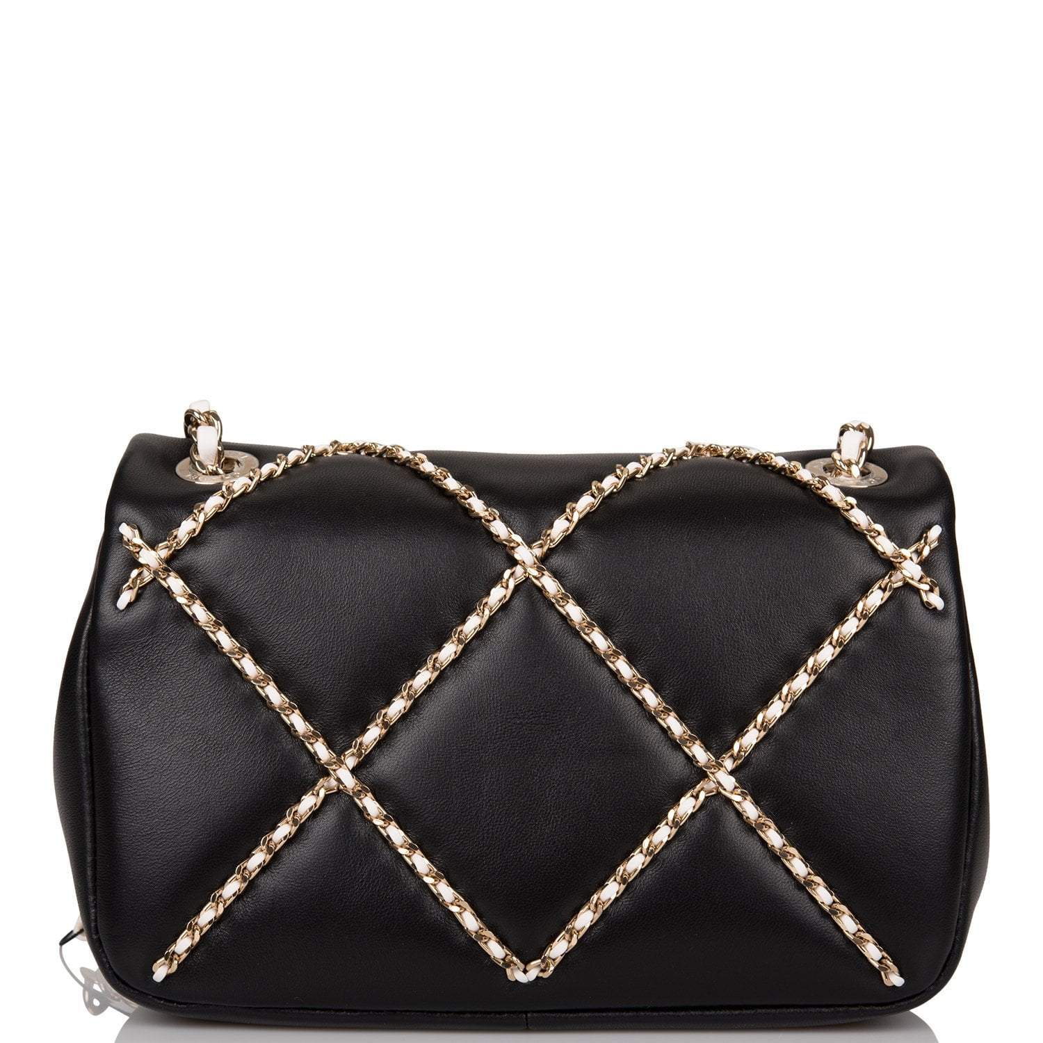 This Small Entwined Chain Flap bag is in black lambskin leather with light gold tone hardware and features a front flap with signature CC turnlock closure, white leather detailing, and adjustable interwoven light gold tone chain link and white leather shoulder strap.