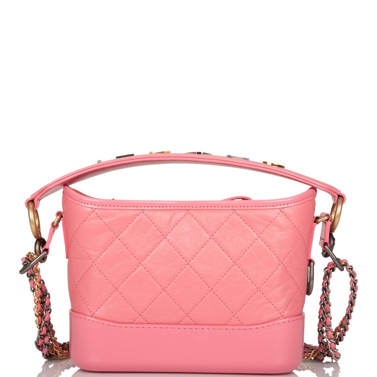This Gabrielle 20 Hobo is of pink lambskin leather with mixed metal hardware and features a removable CHANEL logo strap, zip top closure, smooth calfskin panel around the bottom and interwoven mixed metal chain link with pink leather shoulder/crossbody strap.