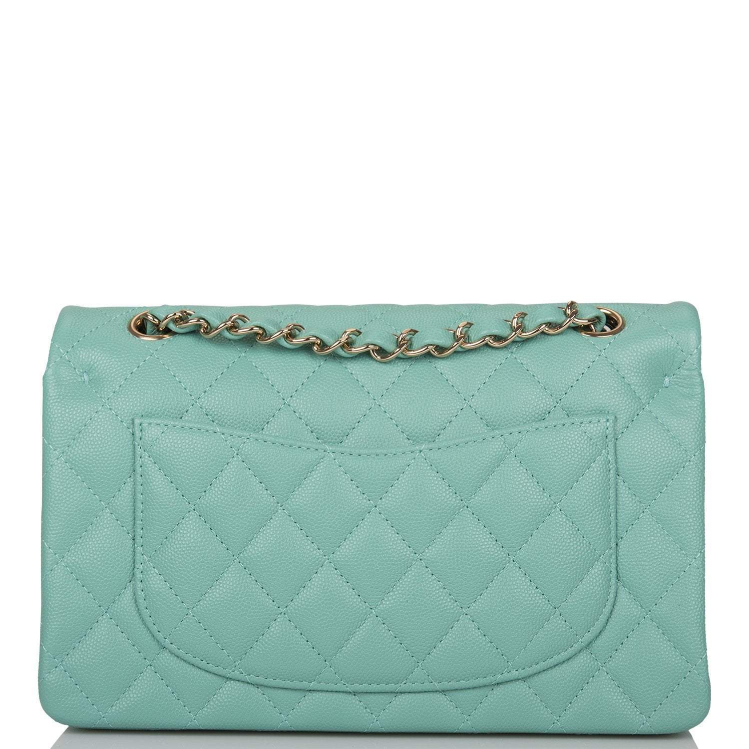 This Small Classic Double Flap bag is in light green caviar leather with light gold tone hardware and features a front flap with signature CC turnlock closure, half moon back pocket, and adjustable interwoven light gold tone chain link and light green leather shoulder strap.