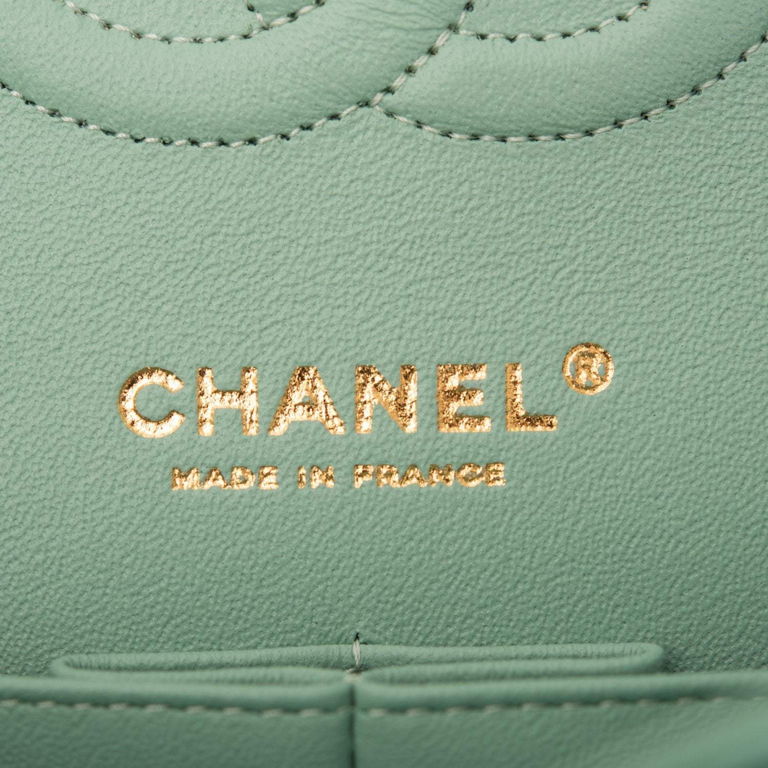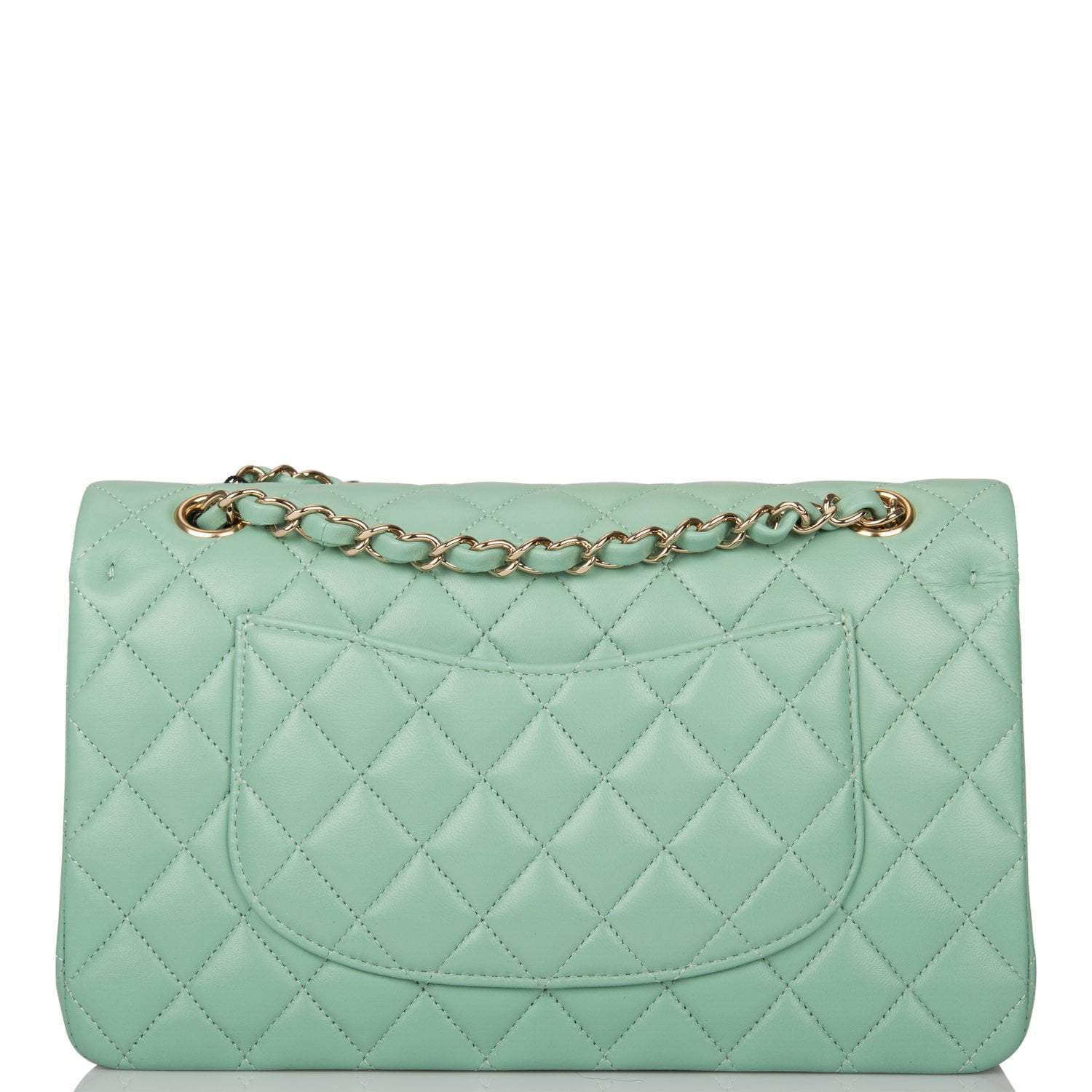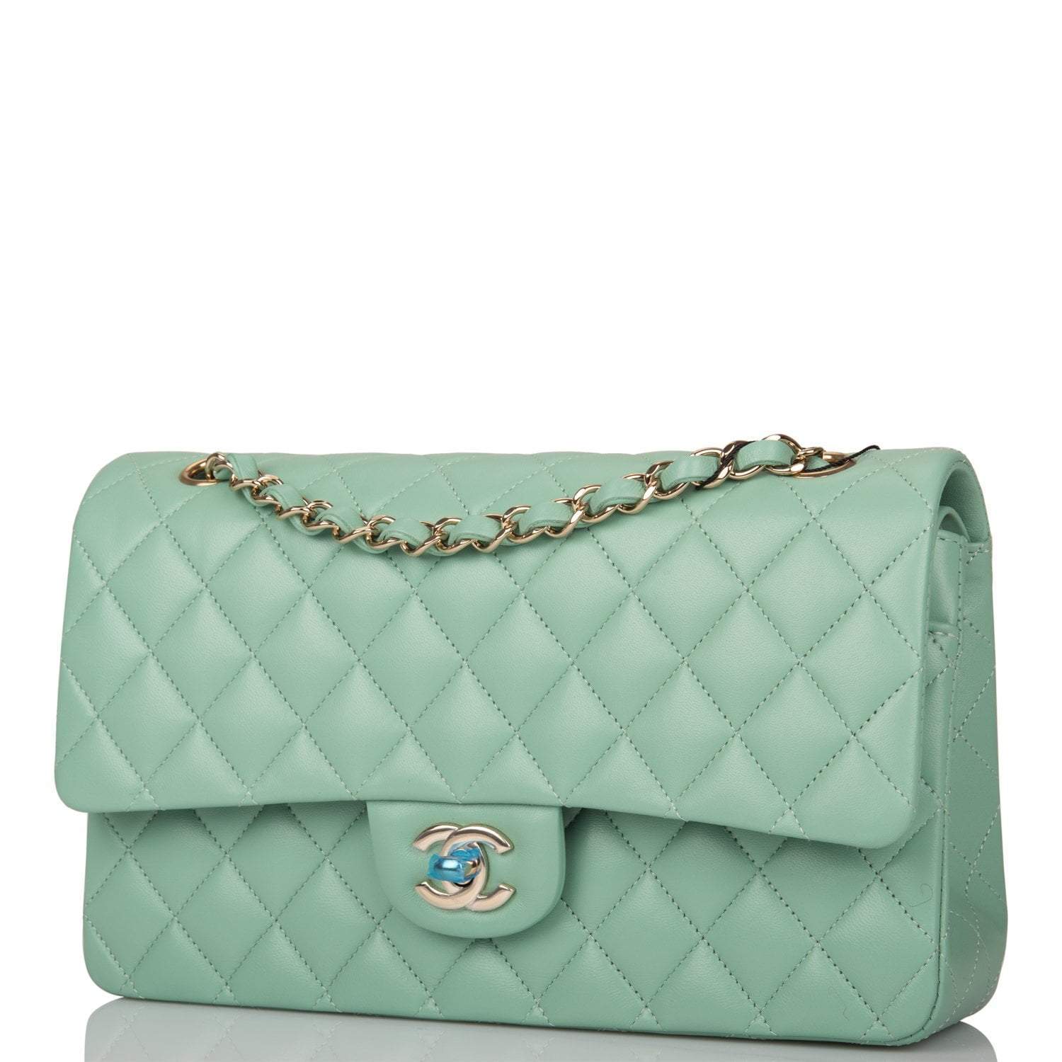 This Medium Classic Double Flap bag is in light green lambskin leather with light gold tone hardware and features a front flap with signature CC turnlock closure, half moon back pocket, and adjustable interwoven light gold tone chain link and light green leather shoulder strap.