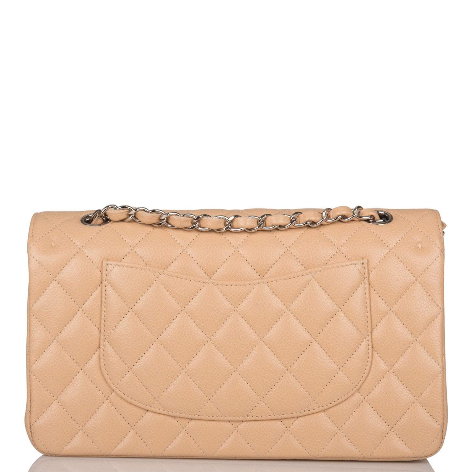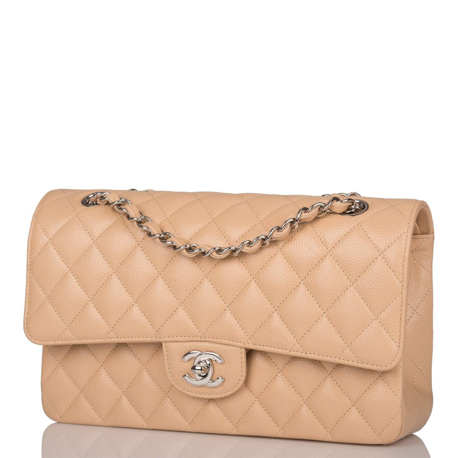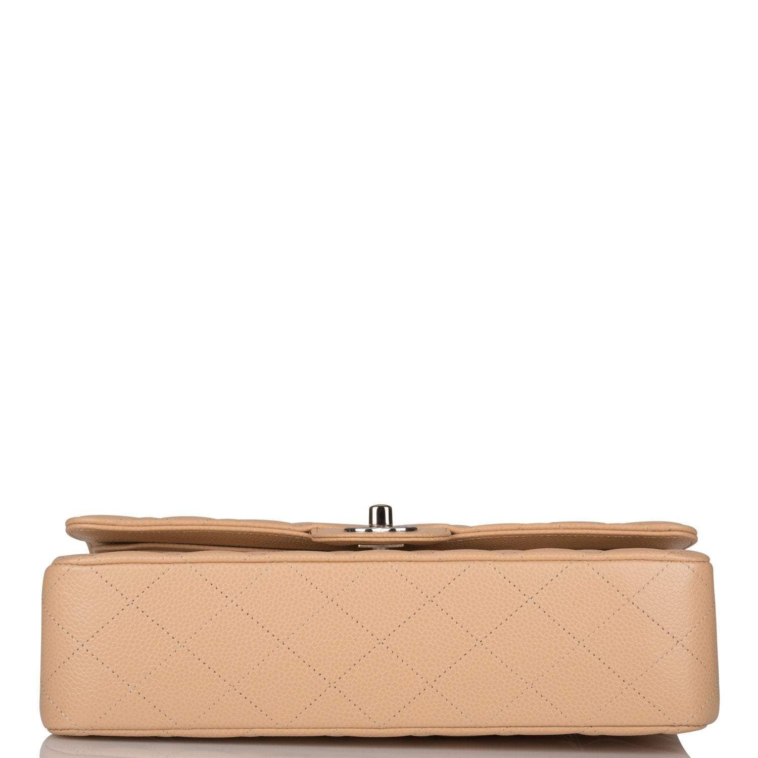 This Medium Classic Double Flap bag is in beige caviar leather with silver tone hardware and features a front flap with signature CC turnlock closure, half moon back pocket, and adjustable interwoven silver tone chain link and beige leather shoulder strap.