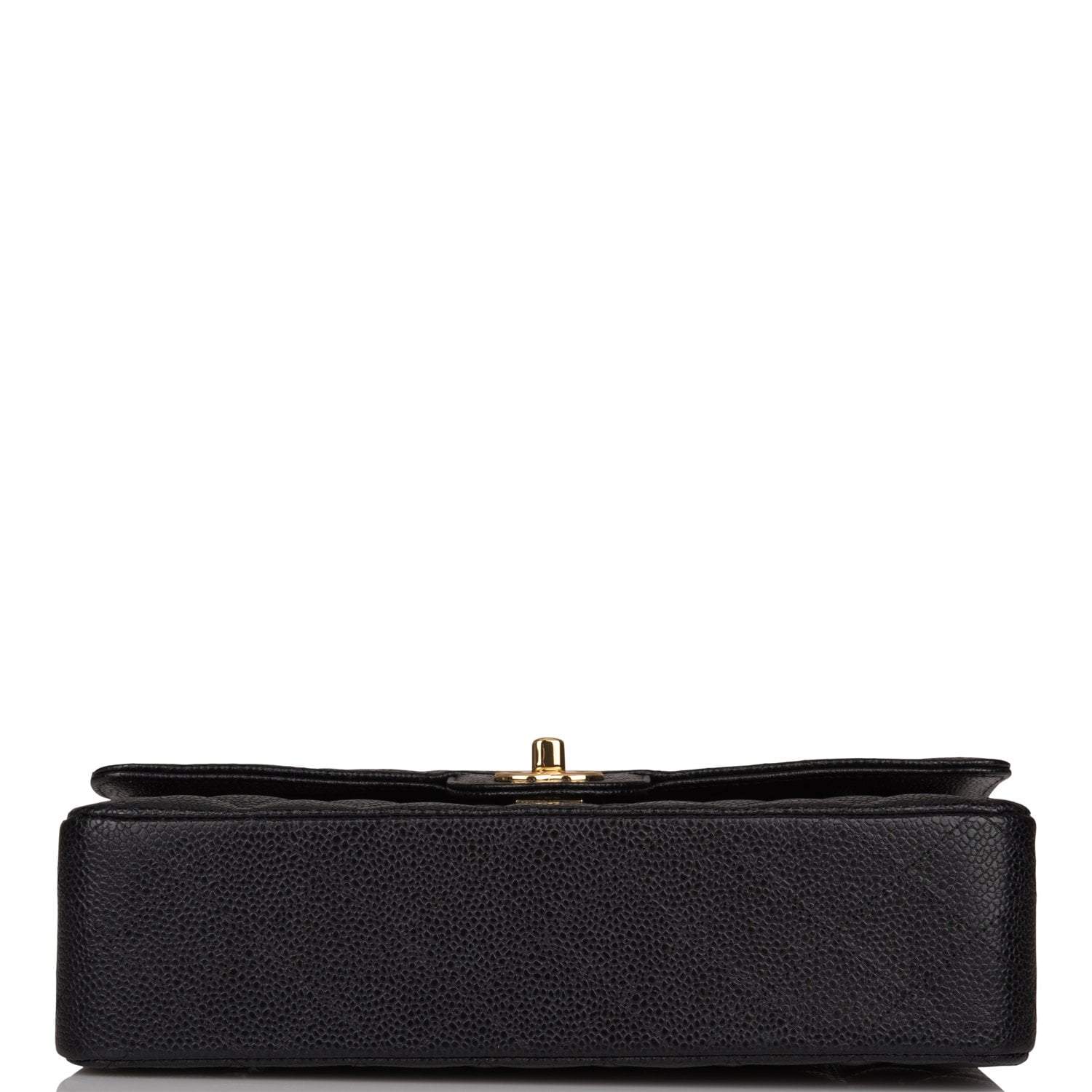 This Medium Classic Double Flap bag is in black caviar leather with gold tone hardware and features a front flap with signature CC turnlock closure, half moon back pocket, and adjustable interwoven gold tone chain link and black leather shoulder strap.