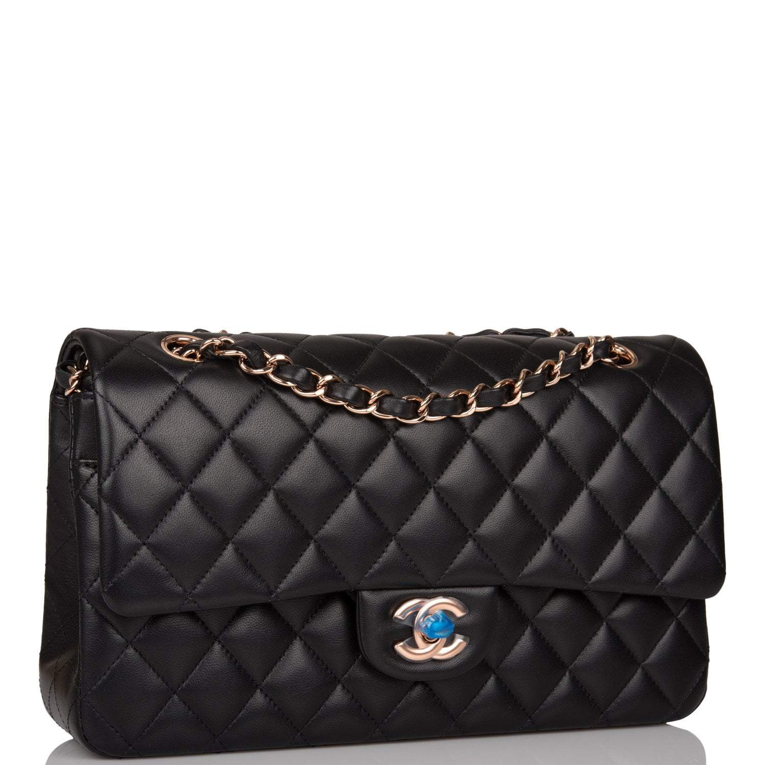 This Medium Classic Double Flap bag is in black lambskin leather with rose gold tone hardware and features a front flap with signature CC turnlock closure, half moon back pocket, and adjustable interwoven rose gold tone chain link and black leather shoulder strap.