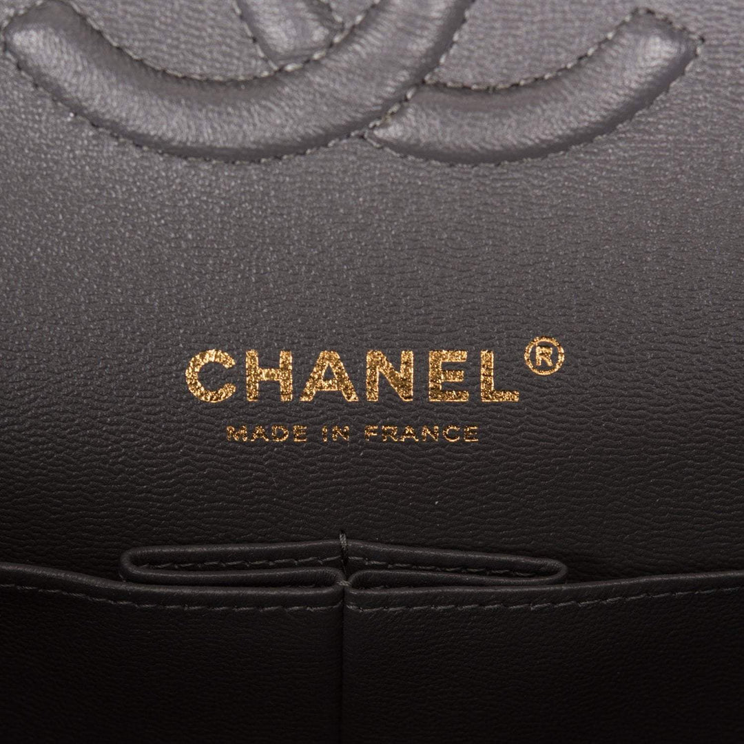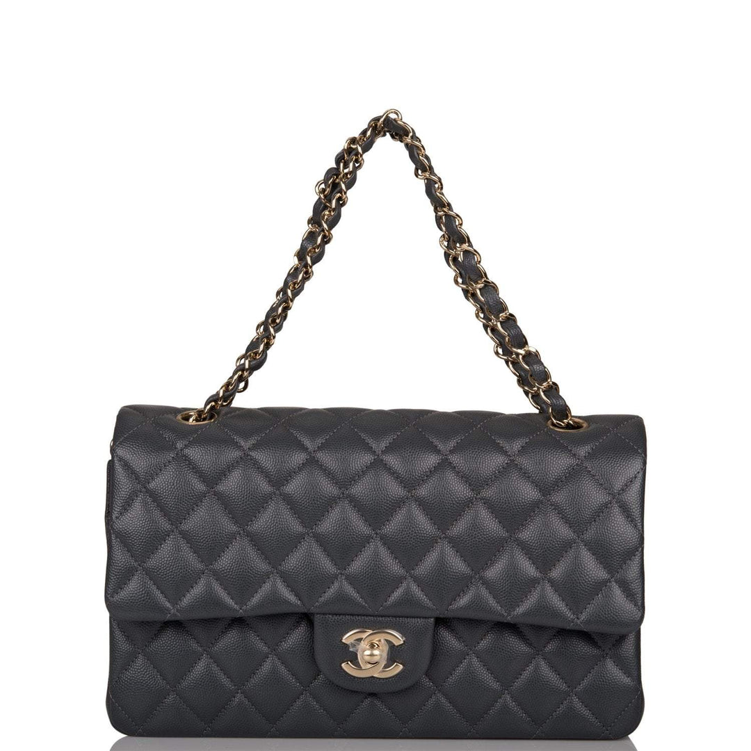 This Medium Classic Double Flap bag is in dark grey caviar leather with light gold tone hardware and features a front flap with signature CC turnlock closure, half moon back pocket, and adjustable interwoven light gold tone chain link and dark grey leather shoulder strap.
