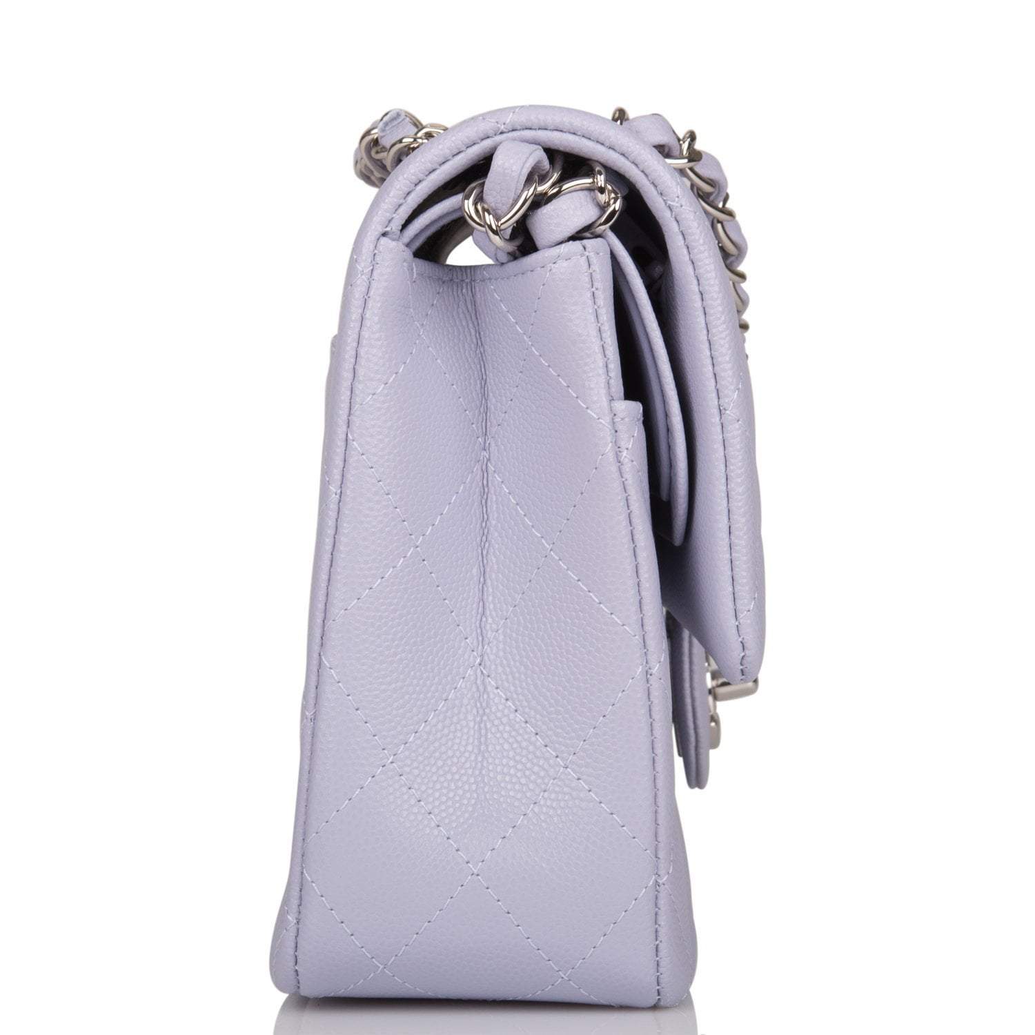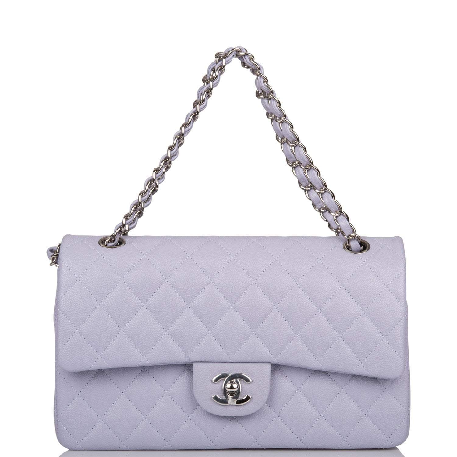 This Medium Classic Double Flap bag is in lavender caviar leather with silver tone hardware and features a front flap with signature CC turnlock closure, half moon back pocket, and adjustable interwoven silver tone chain link and light purple leather shoulder strap.