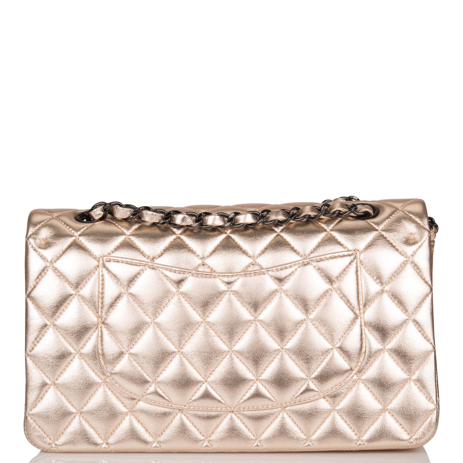 This Medium Classic Double Flap bag is in metallic gold lambskin leather with black tone hardware and features a front flap with signature CC turnlock closure, half moon back pocket, and adjustable interwoven black tone chain link and metallic gold leather shoulder strap.