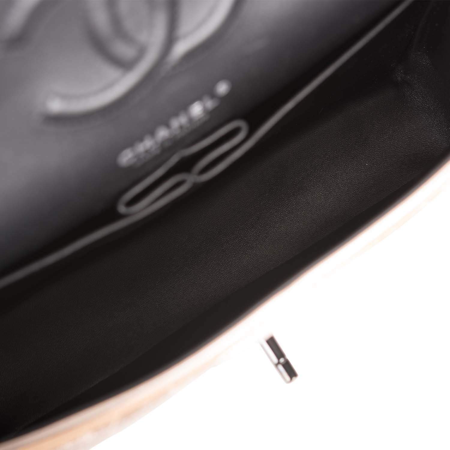 The interior is lined in black leather with the “love letter” zipper compartment under the first flap, an “outer” slit pocket is under the second flap, and an interior compartment with two open pockets separated by a “lipstick” compartment.