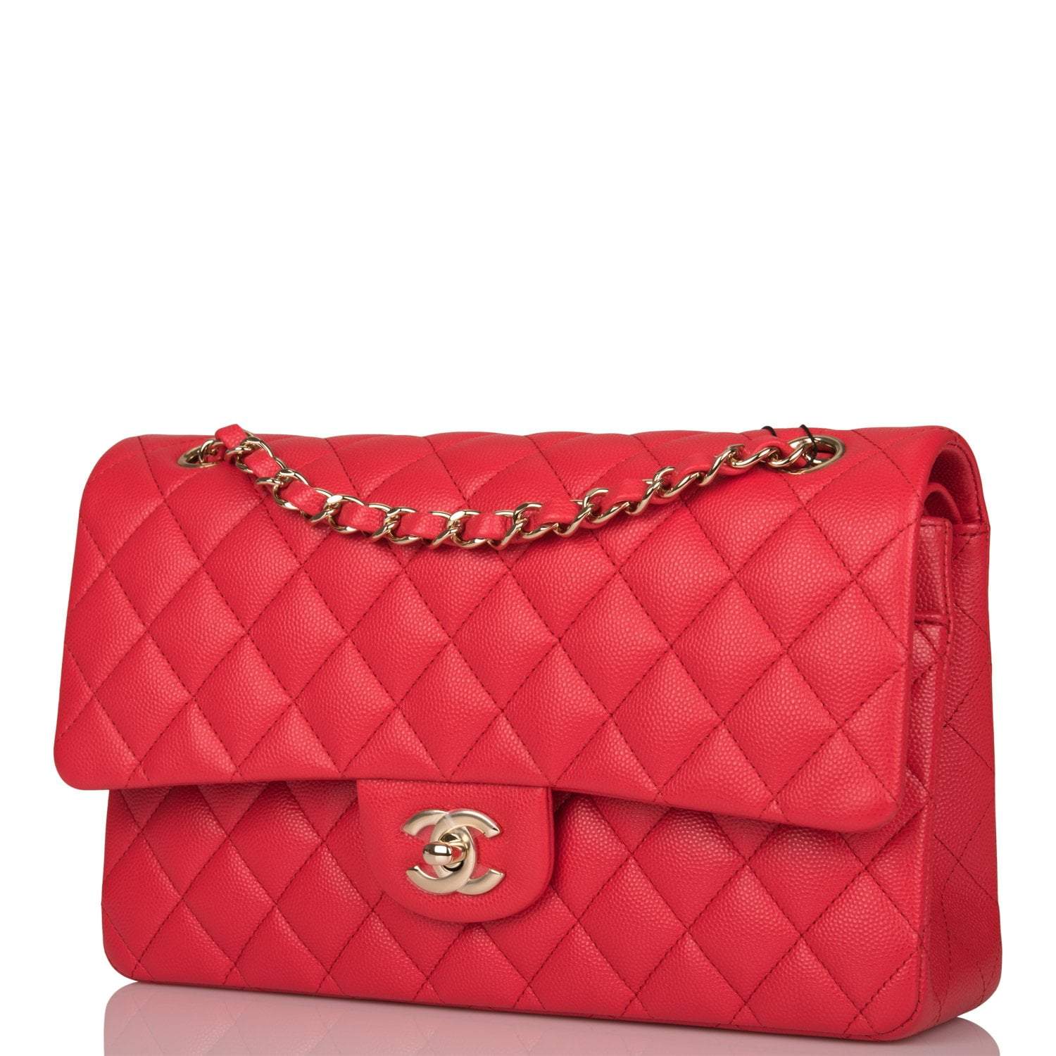 This Medium Classic Double Flap bag is in red caviar leather with light gold tone hardware and features a front flap with signature CC turnlock closure, half moon back pocket, and adjustable interwoven light gold tone chain link and red leather shoulder strap.