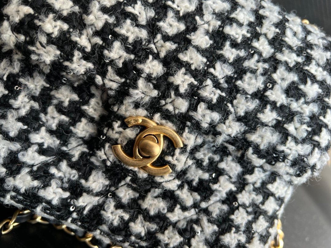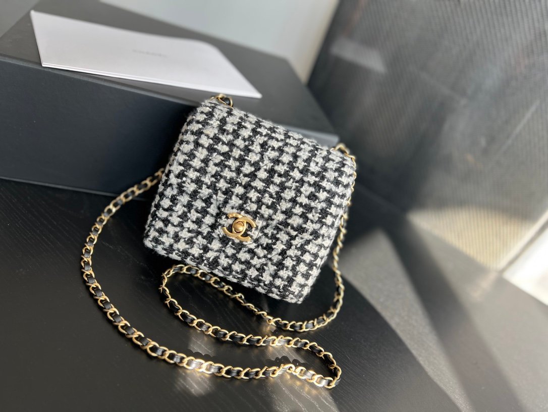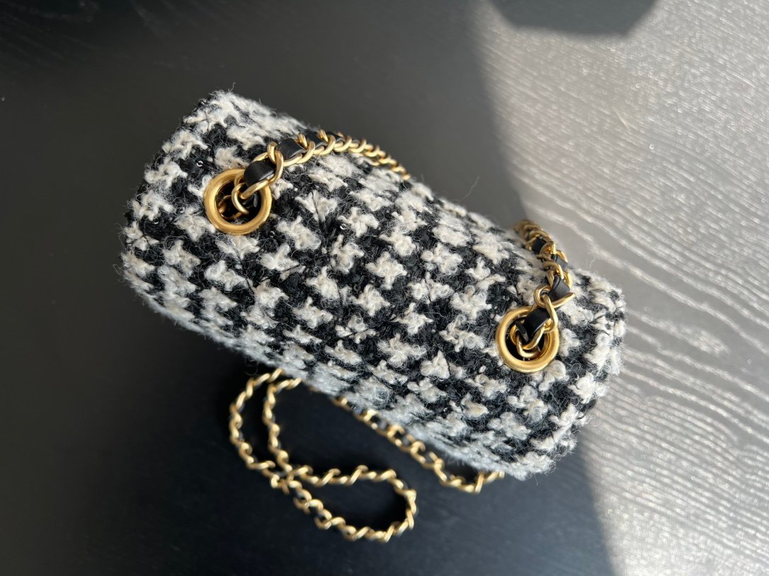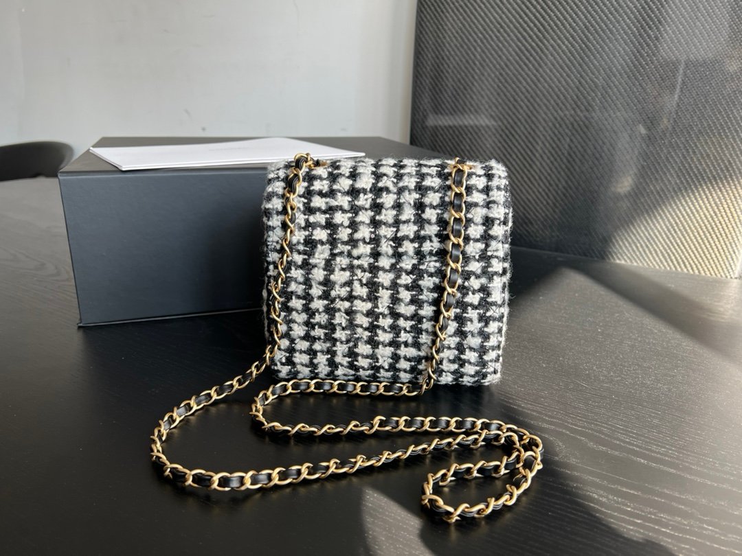 Mini Flap Bag With Handle is formatted in an elongated, vertical direction. The bag has a mini flap and a top handle for convenience during use. In addition, familiar elements such as the strap, the nested two-C logo are still seen in this new design. The fabric layer is the highlight when it is combined between cotton and Chanel’s signature fabric. Mixed colors of black and white with tight embossed diamond-shaped stitching.