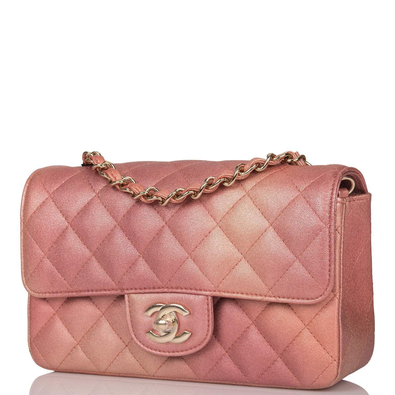 This Mini Rectangular flap bag is in ombre pink metallic lambskin with light gold tone hardware and has a front flap with signature CC turnlock closure, rear half moon pocket and single interwoven ombre pink leather and light gold tone chain link shoulder/crossbody strap.