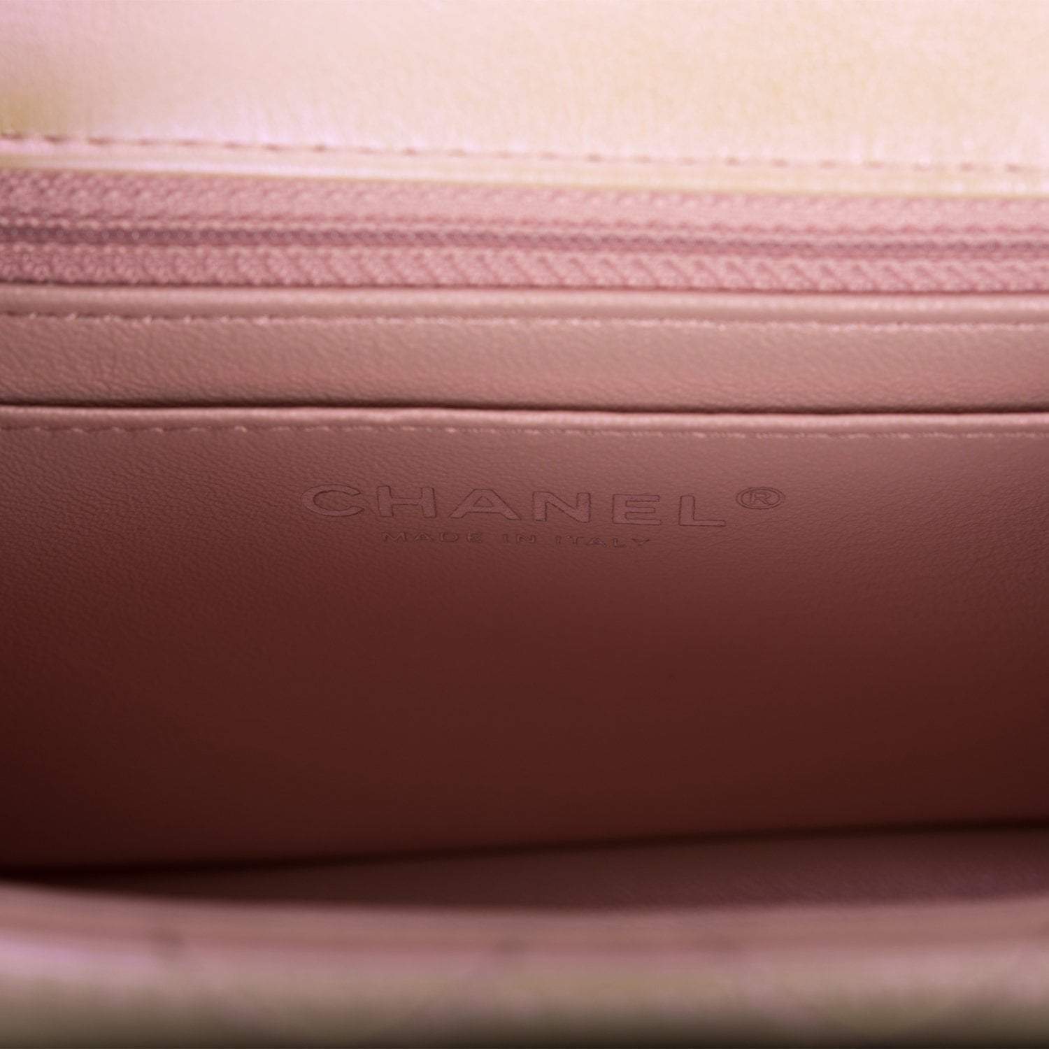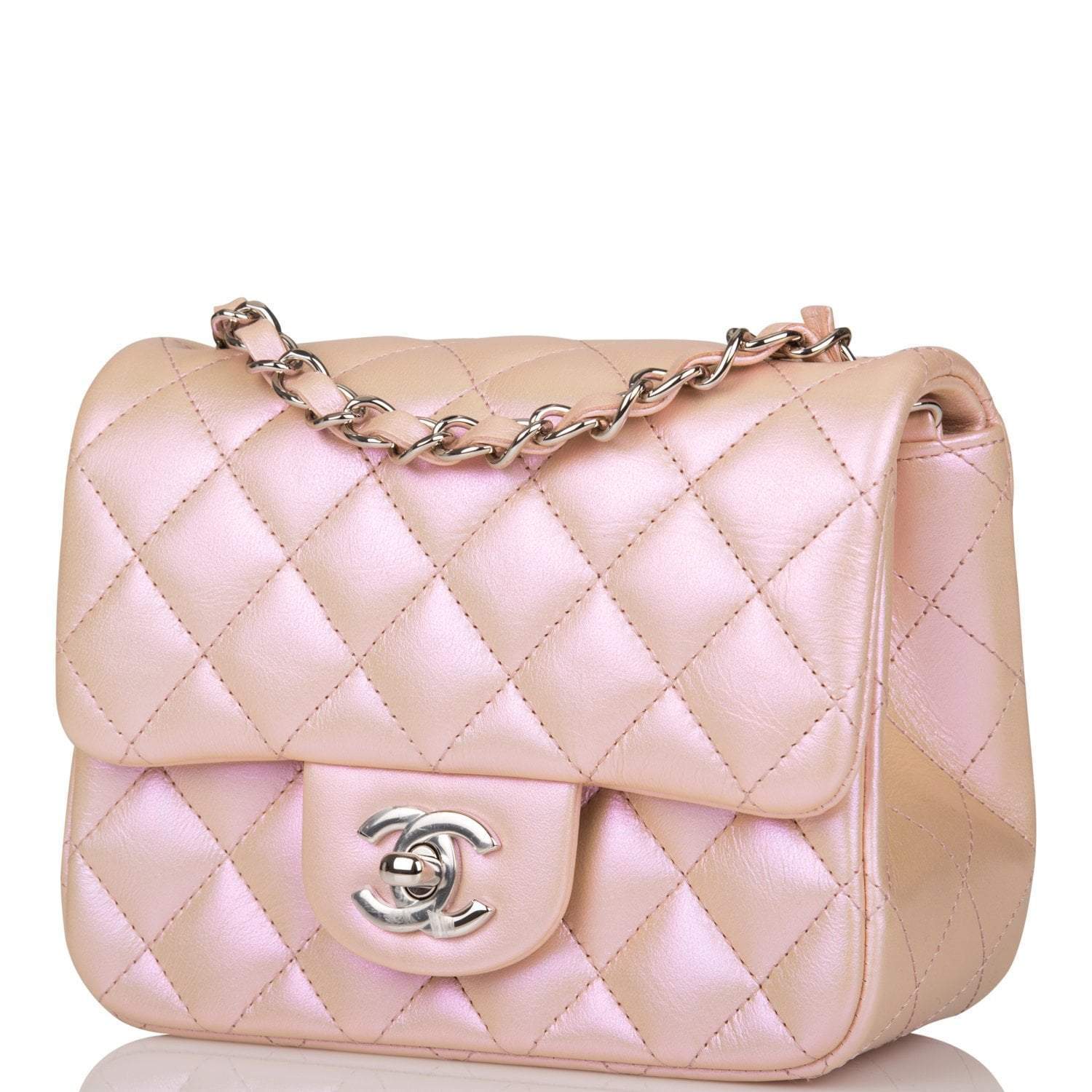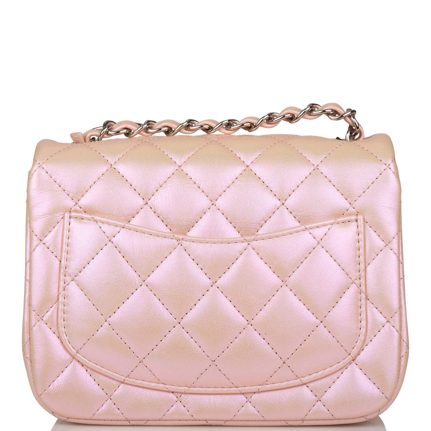 This Mini Square flap bag is in pink iridescent lambskin with silver tone hardware and has a front flap with signature CC turnlock closure, rear half moon pocket and single interwoven pink leather and silver tone chain link shoulder/crossbody strap.