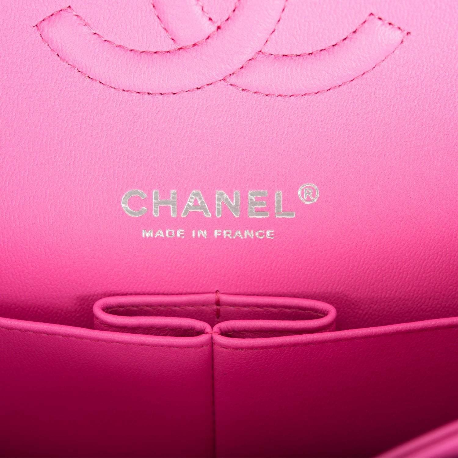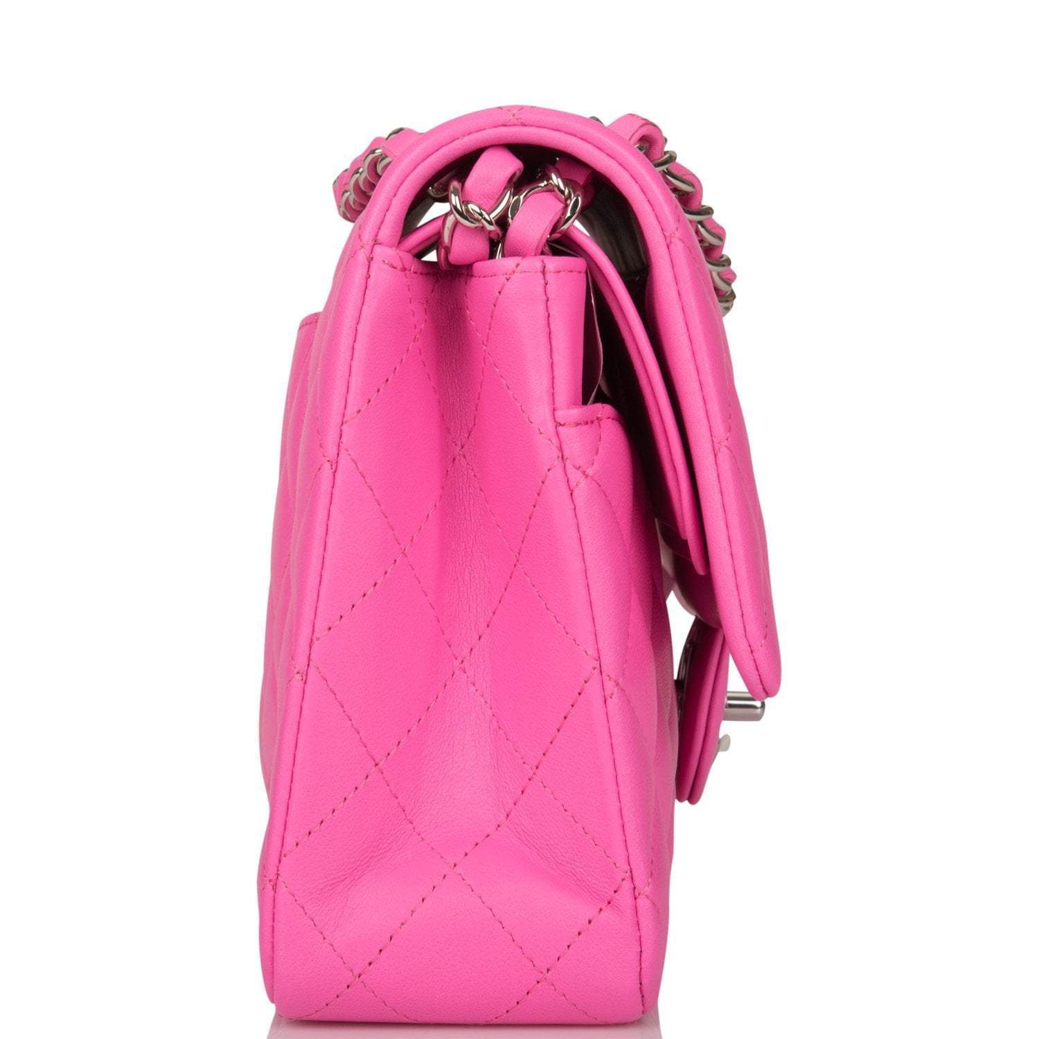 This Medium Classic Double Flap bag is in neon pink lambskin leather with silver tone hardware and features a front flap with signature CC turnlock closure, half moon back pocket, and adjustable interwoven silver tone chain link and neon pink leather shoulder strap.