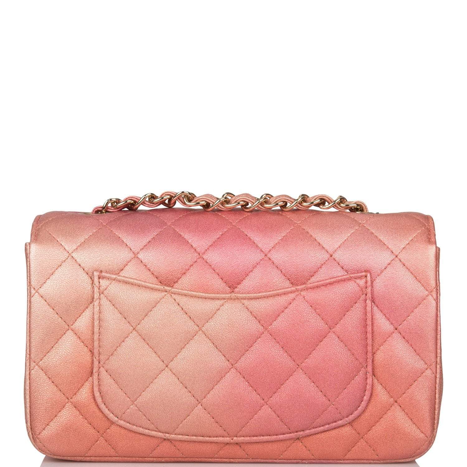 This Mini Rectangular flap bag is in ombre pink metallic lambskin with light gold tone hardware and has a front flap with signature CC turnlock closure, rear half moon pocket and single interwoven ombre pink leather and light gold tone chain link shoulder/crossbody strap.