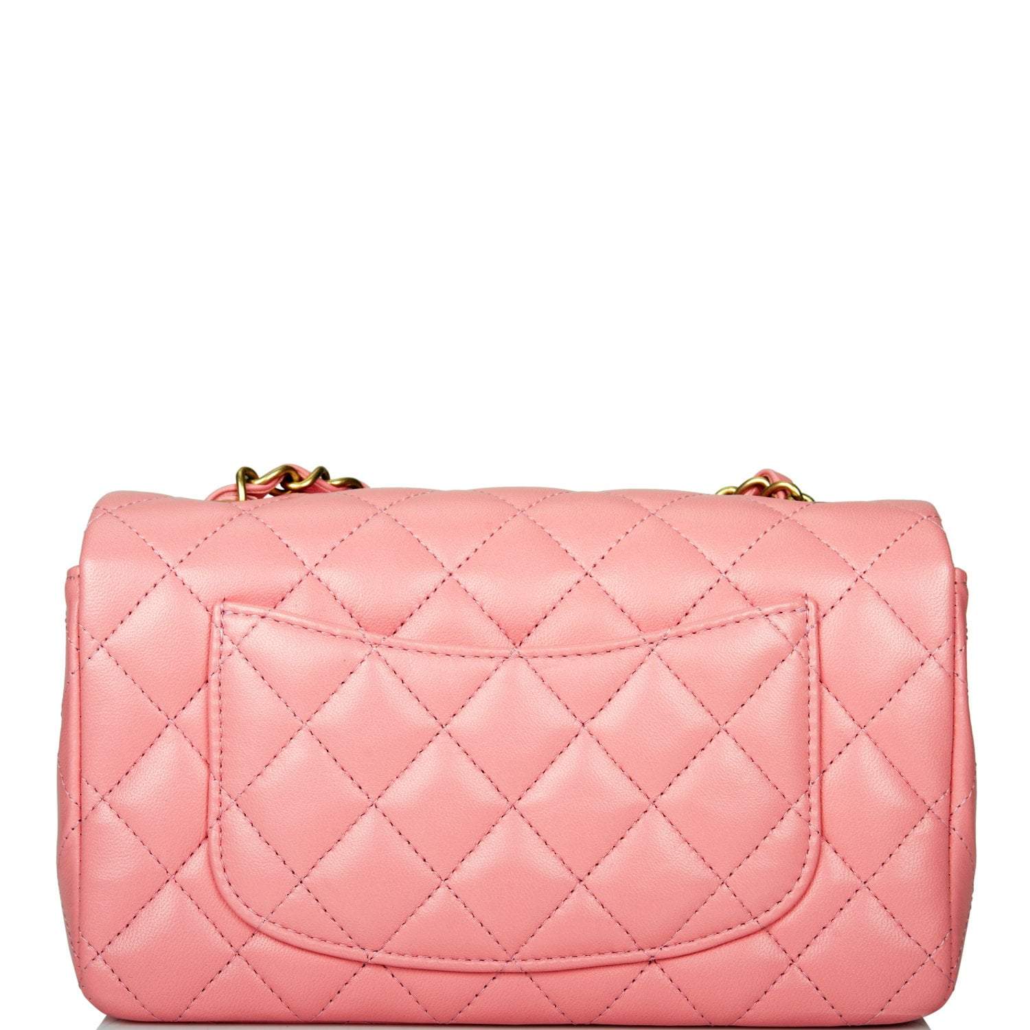 This Mini Rectangular flap bag is of pink lambskin leather with antique gold tone hardware and has a front flap with signature CC turnlock closure, rear half moon pocket, single interwoven pink leather and antique gold tone chain link shoulder/crossbody strap.