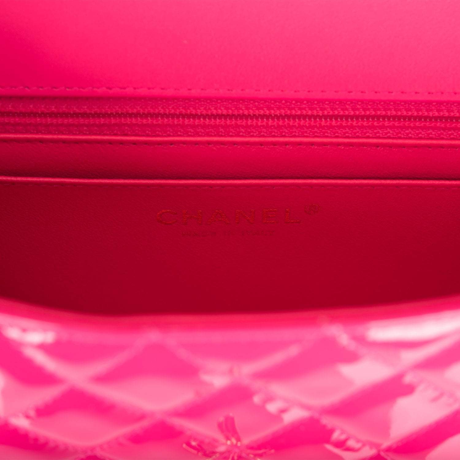 The interior is lined in pink leather and features a zipper pocket with Chanel pull and an open pocket below.