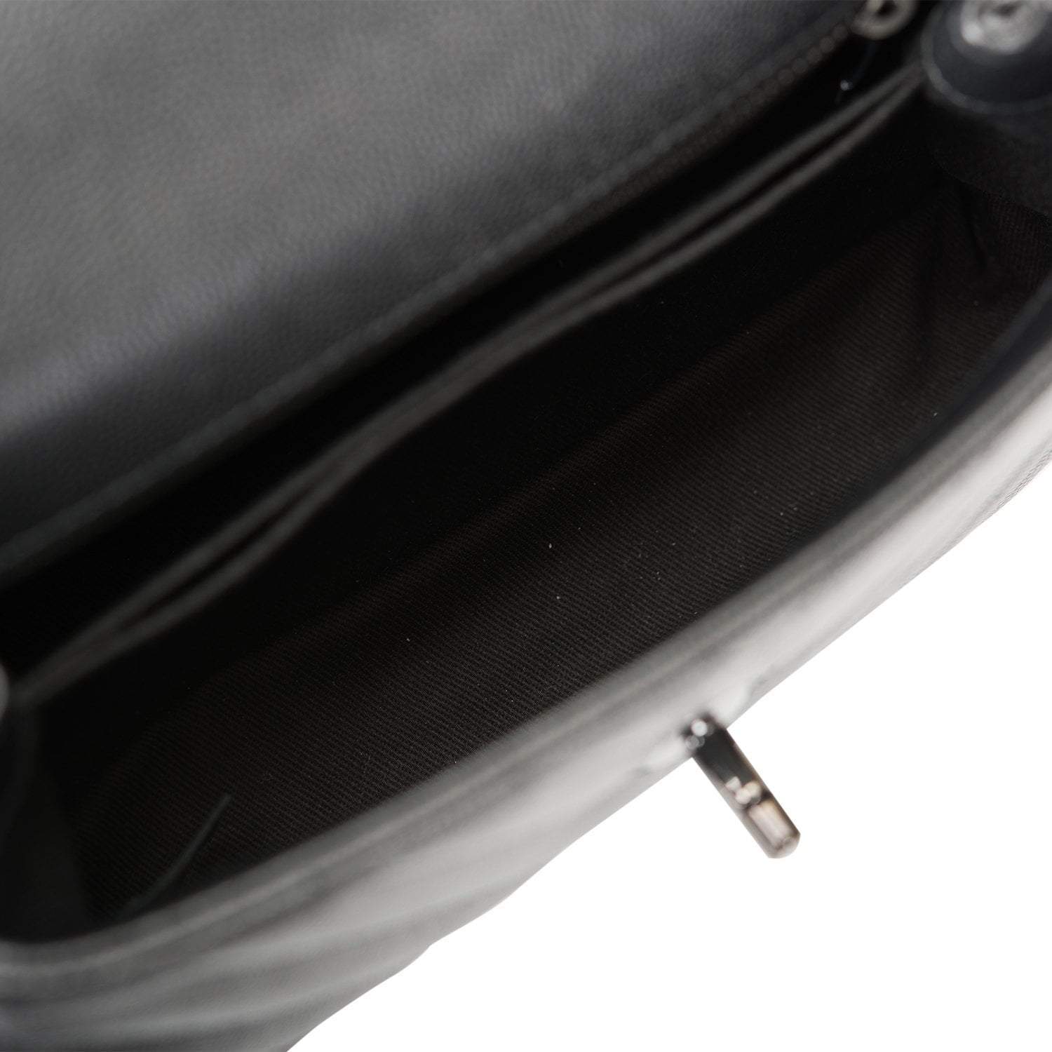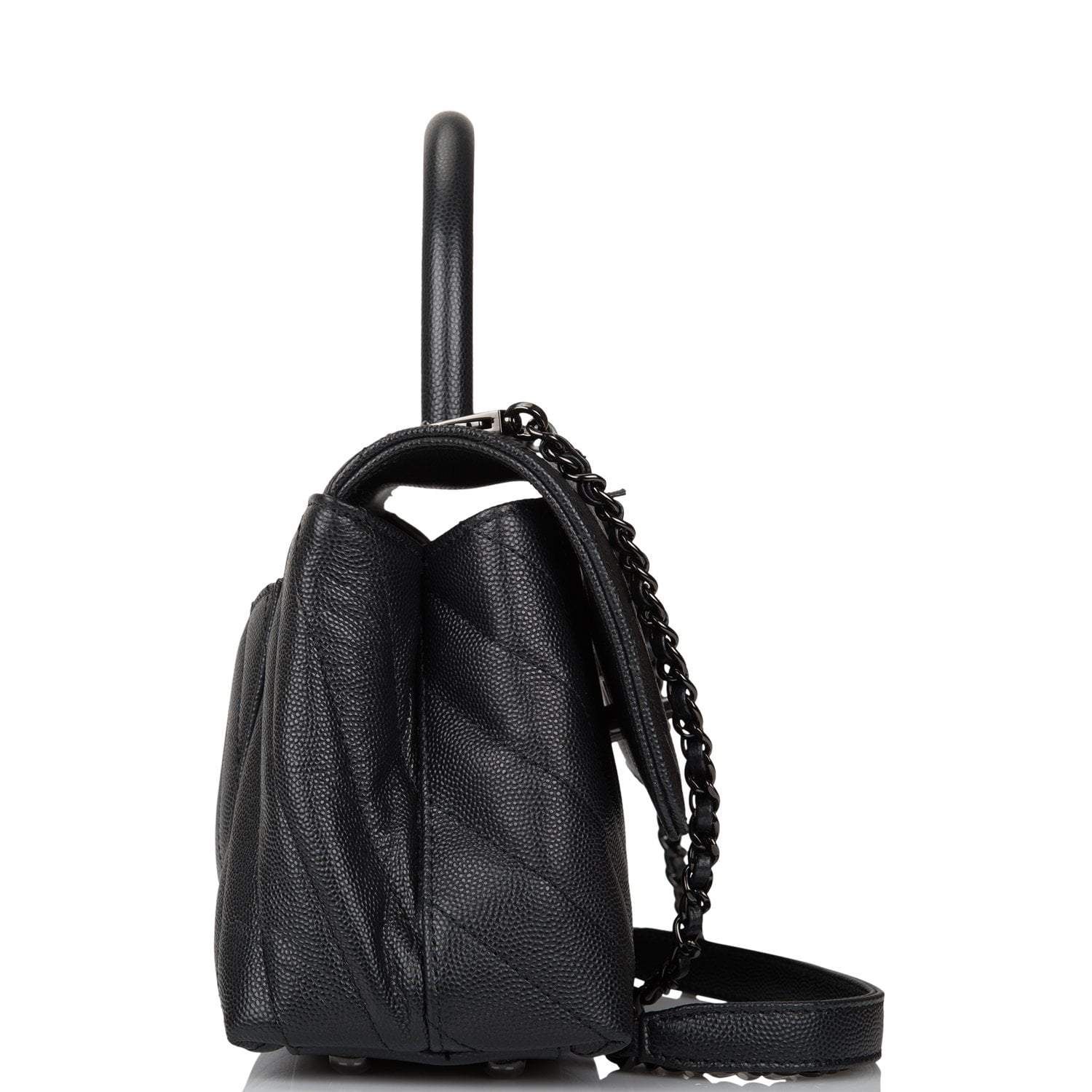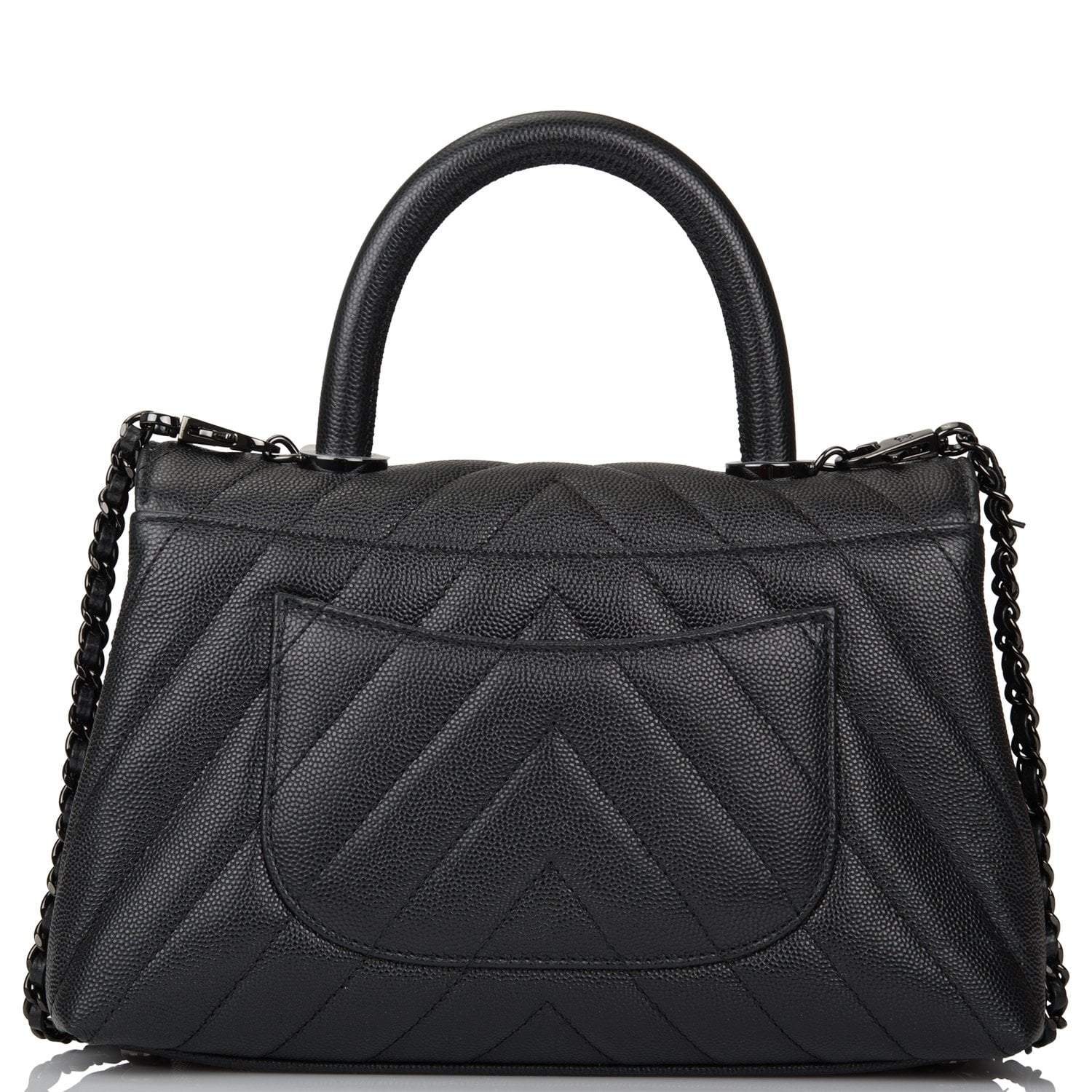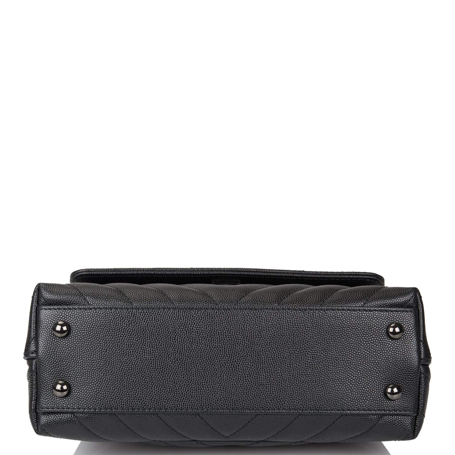 This Mini Coco Handle is of black caviar leather with black hardware and features a trapezoidal shape, signature CC interlocking closure, top handle, and long black metal and black leather chain.