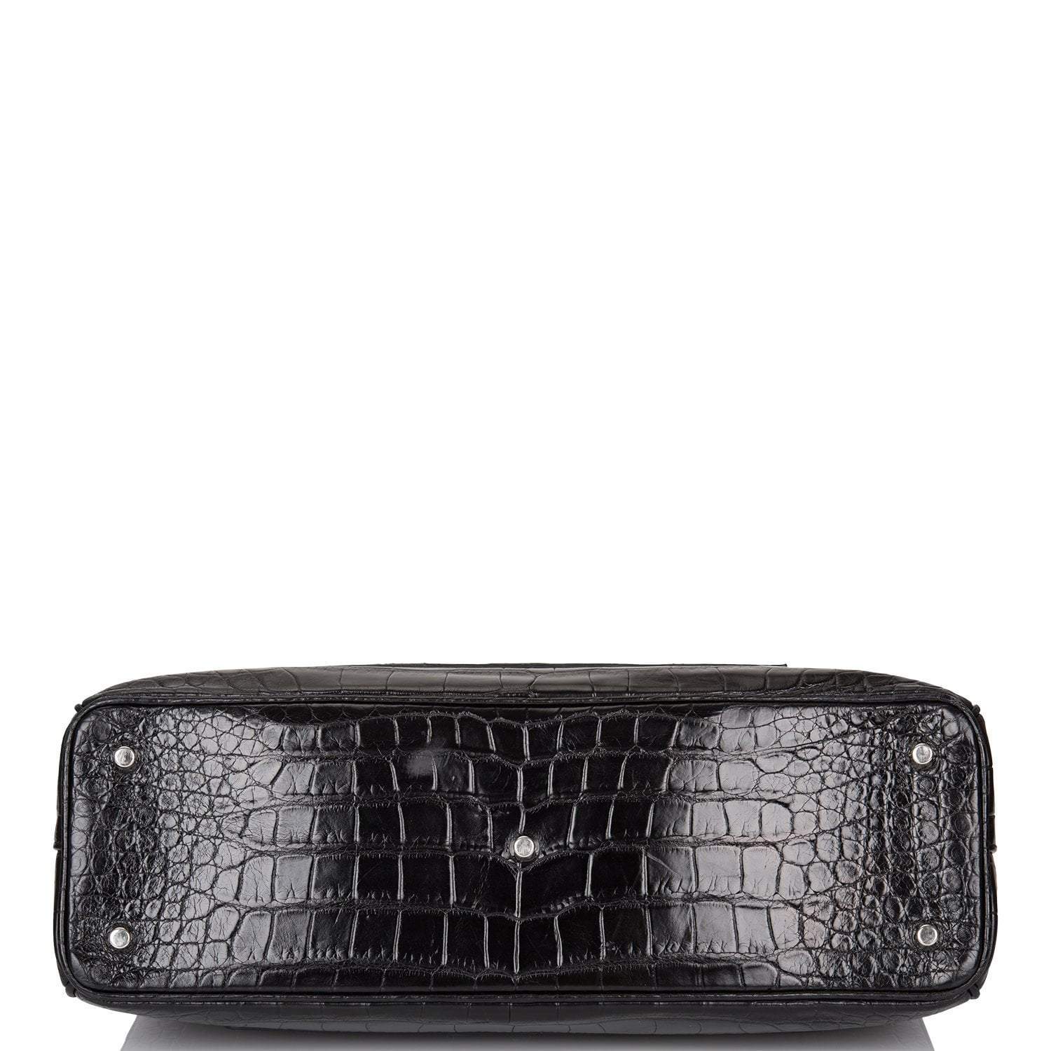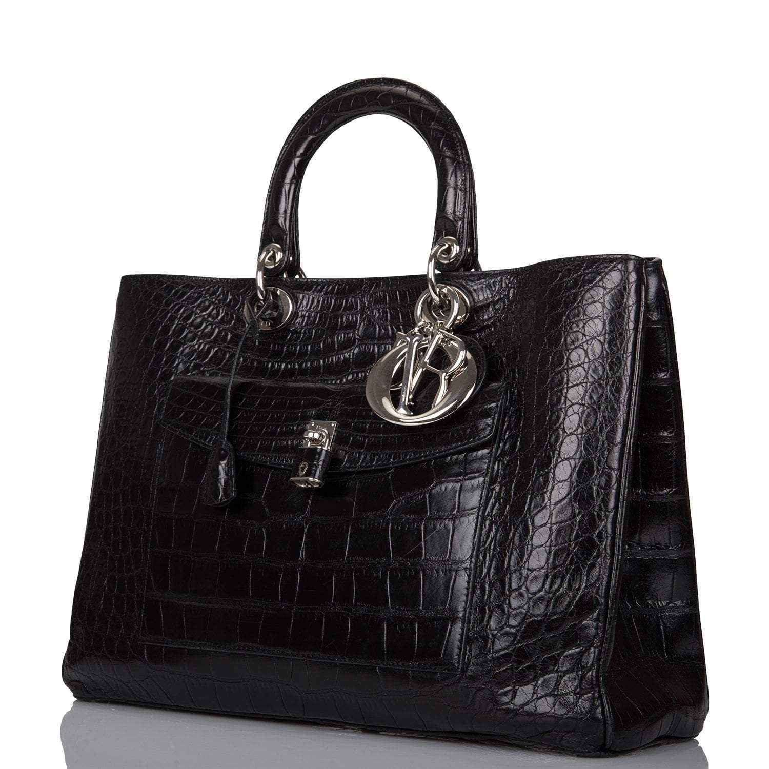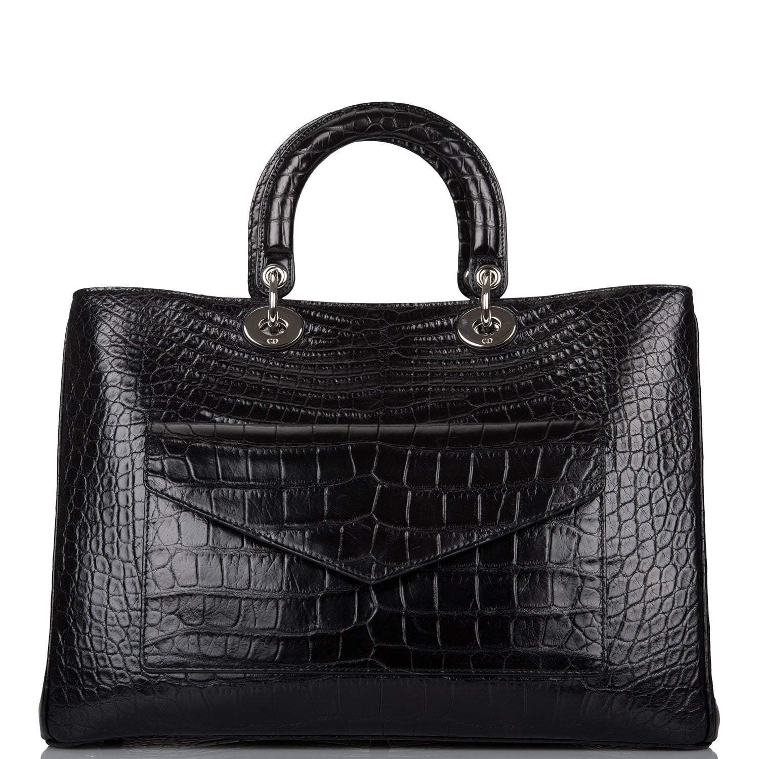 This Diorissimo Tote is in black matte alligator with silver hardware and has two black top handles, five bottom feet, Dior logo charms, clochette, lock, key, exterior flap pocket on front and back of bag, black shoulder strap with silver tone hardware.