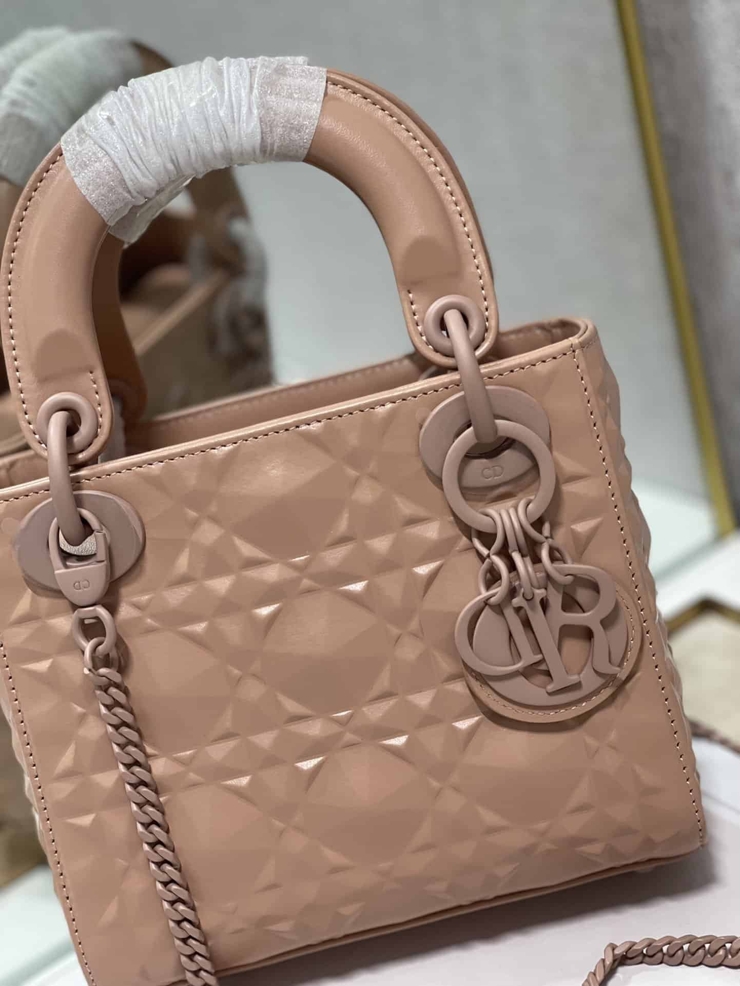 The Lady Dior handbag epitomizes the House’s vision of elegance and beauty. Refined and sleek, this creation is timeless. Covered with Cannage stitching, it boasts an instantly recognizable quilted texture. The metal ‘D.I.O.R.’ charms embellish and illuminate its silhouette. Featuring a removable chain shoulder strap, the miniature Lady Dior bag can be carried by hand or worn crossbody as an ideal evening wear companion.