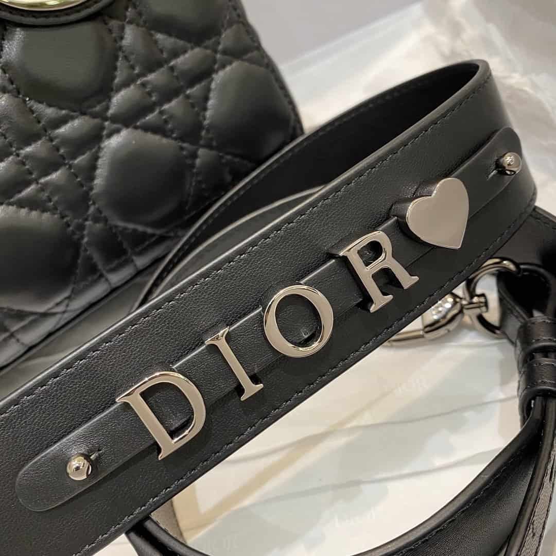The Lady Dior bag epitomizes Dior’s vision of elegance and beauty. Sleek and refined, the timeless style is crafted in black with Cannage stitching, creating the instantly recognizable quilted texture. Shiny silver-finish metal ‘D.I.O.R.’ charms further embellish its silhouette. The small Lady Dior bag features a thin, removable shoulder strap and can be carried by hand or worn crossbody.