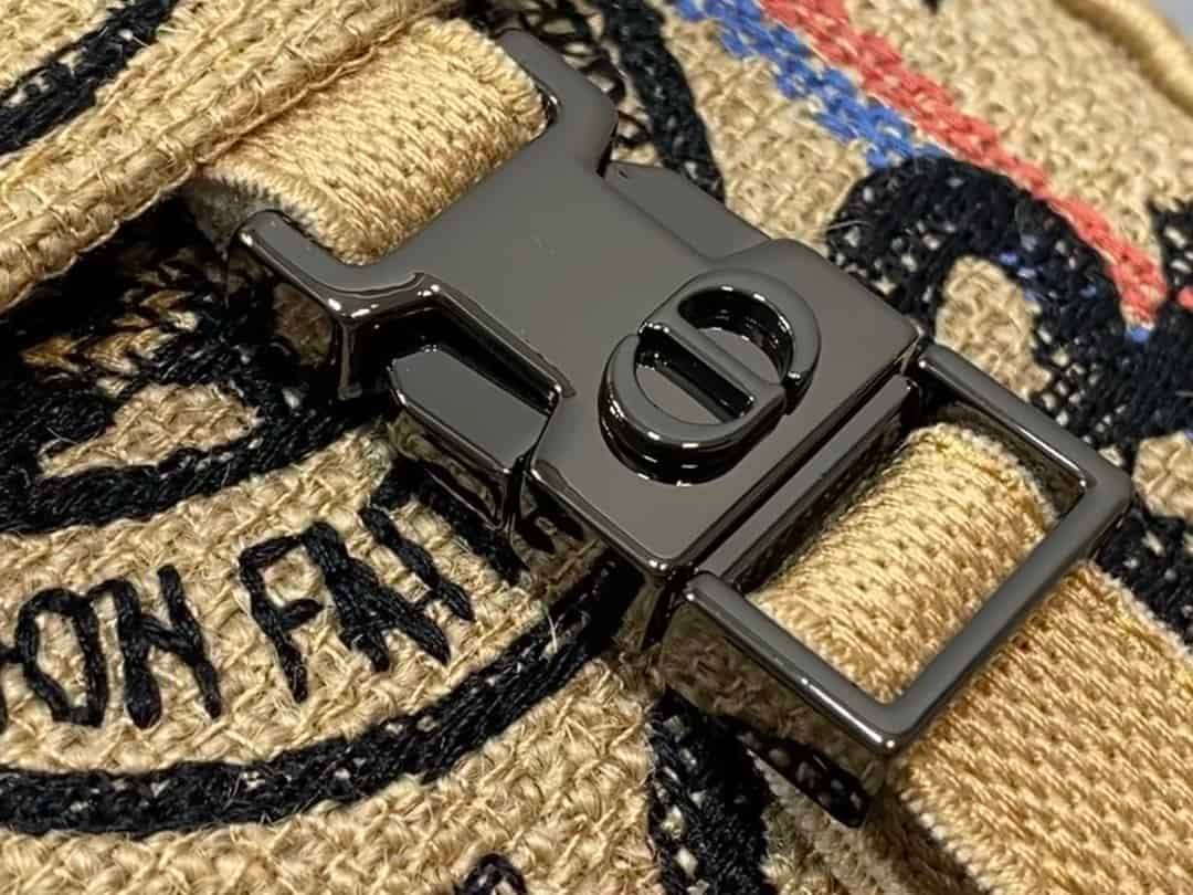 • Maria Grazia Chiuri has updated the classic messenger bag by adding signature Dior details for a relaxed and modern look. Crafted in beige jute embroidered canvas, the bag features the ‘L’Union Fait la Force’ motto, inspired by the atelier’s jute bags and reaffirming the participative dimension dear to Maria Grazia Chiuri. A ‘CHRISTIAN DIOR PARIS’ signature flap and sportswear-inspired ‘CD’ buckles in ruthenium-finish brass complete the small design. Equipped with an adjustable and removable shoulder strap, the compact messenger bag can be worn over the shoulder or crossbody, and will make an ideal urban companion.