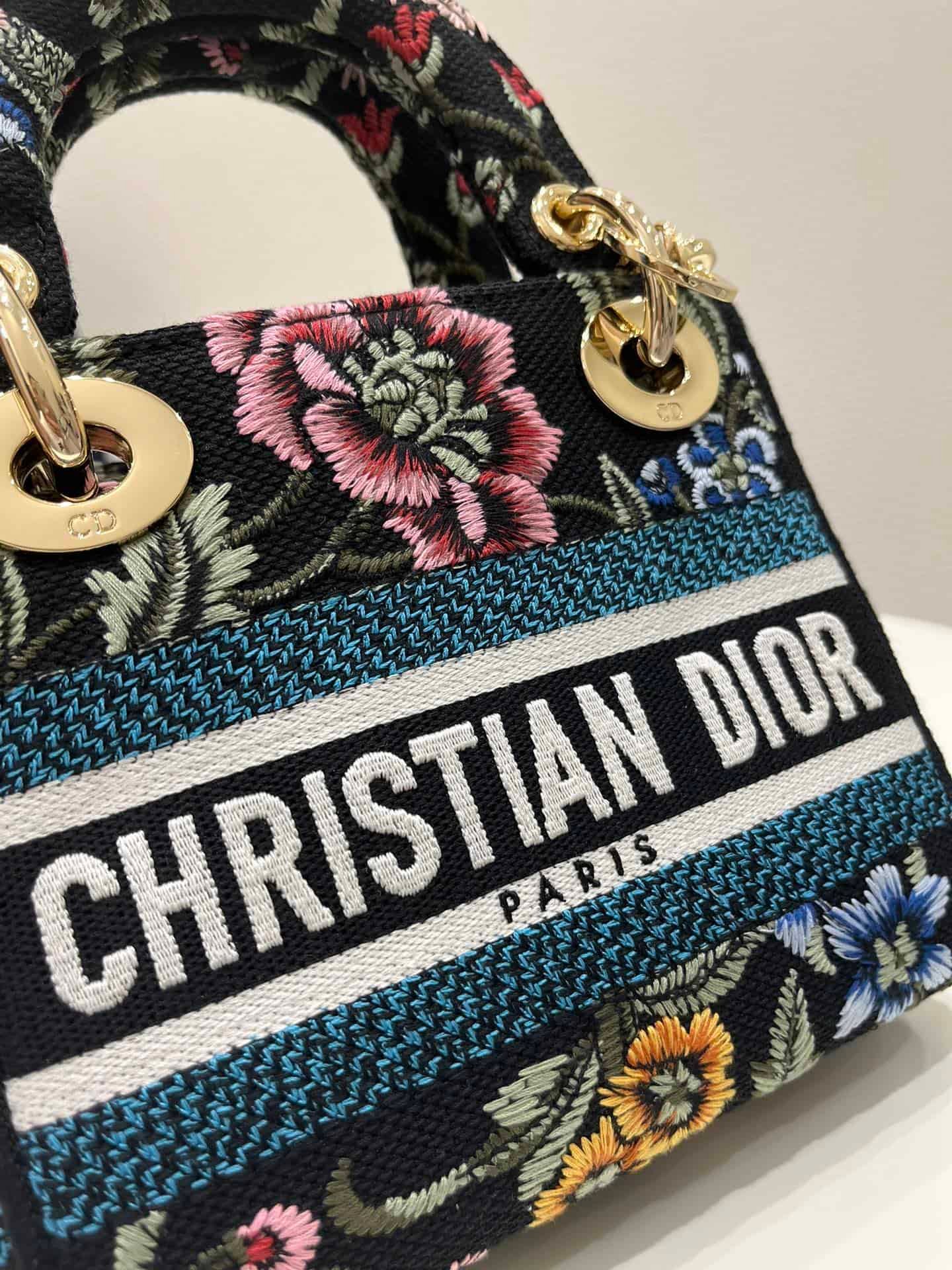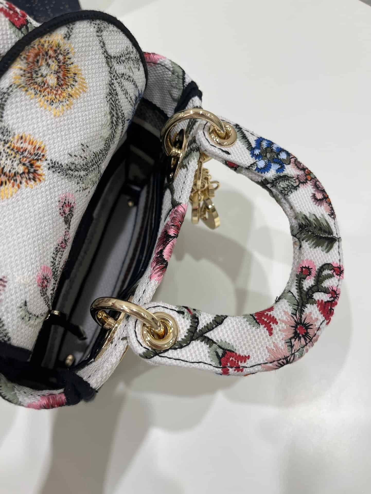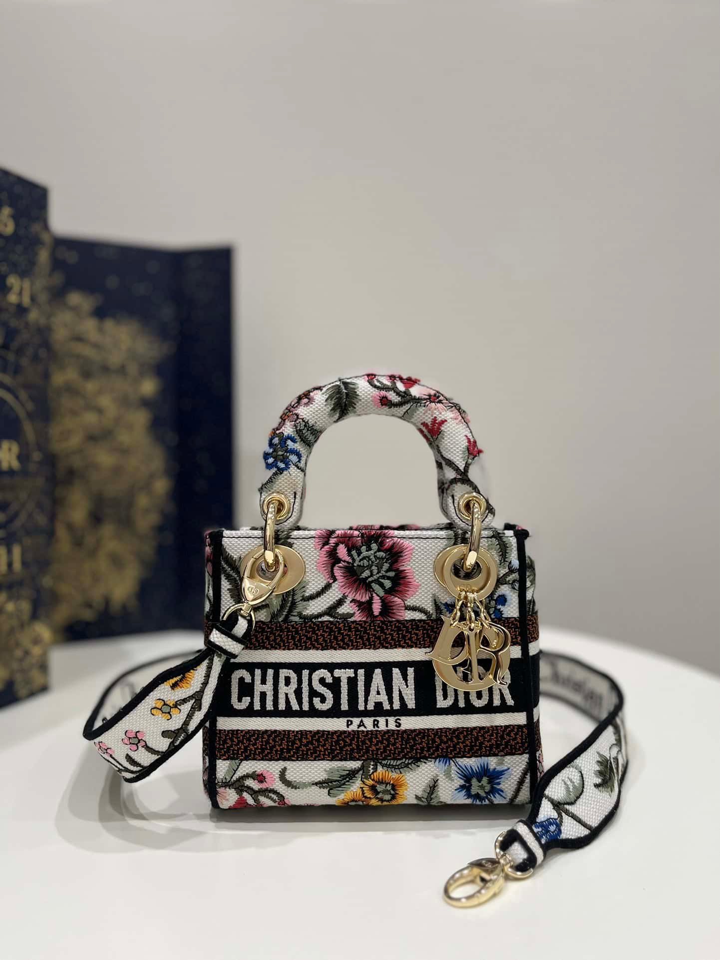The Mini Lady D-Lite bag combines classic elegance with House modernity. The style is fully embroidered with the multicolor Dior Petites Fleurs motif, a romantic and vibrant homage to Mr. Dior’s passion for florals. A Christian Dior Paris signature adorns the front, while D.I.O.R. charms in pale gold-finish metal further enhance and highlight the silhouette. Featuring a wide embroidered shoulder strap, the miniature Lady D-Lite bag can be carried by hand, worn over the shoulder or crossbody.