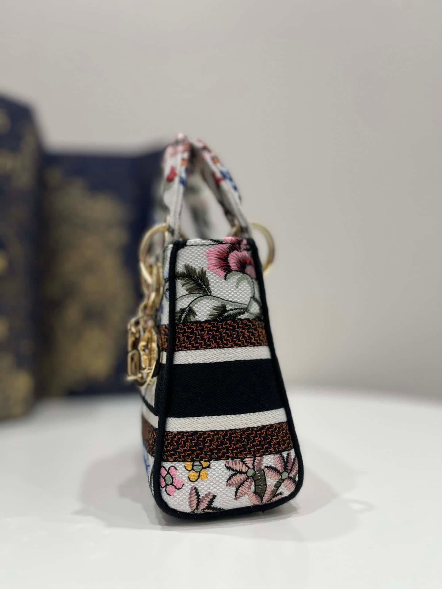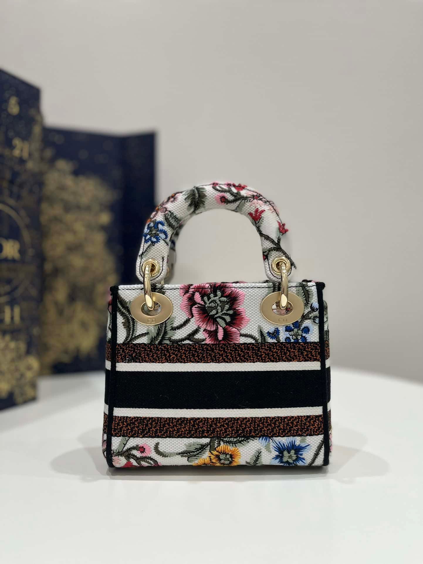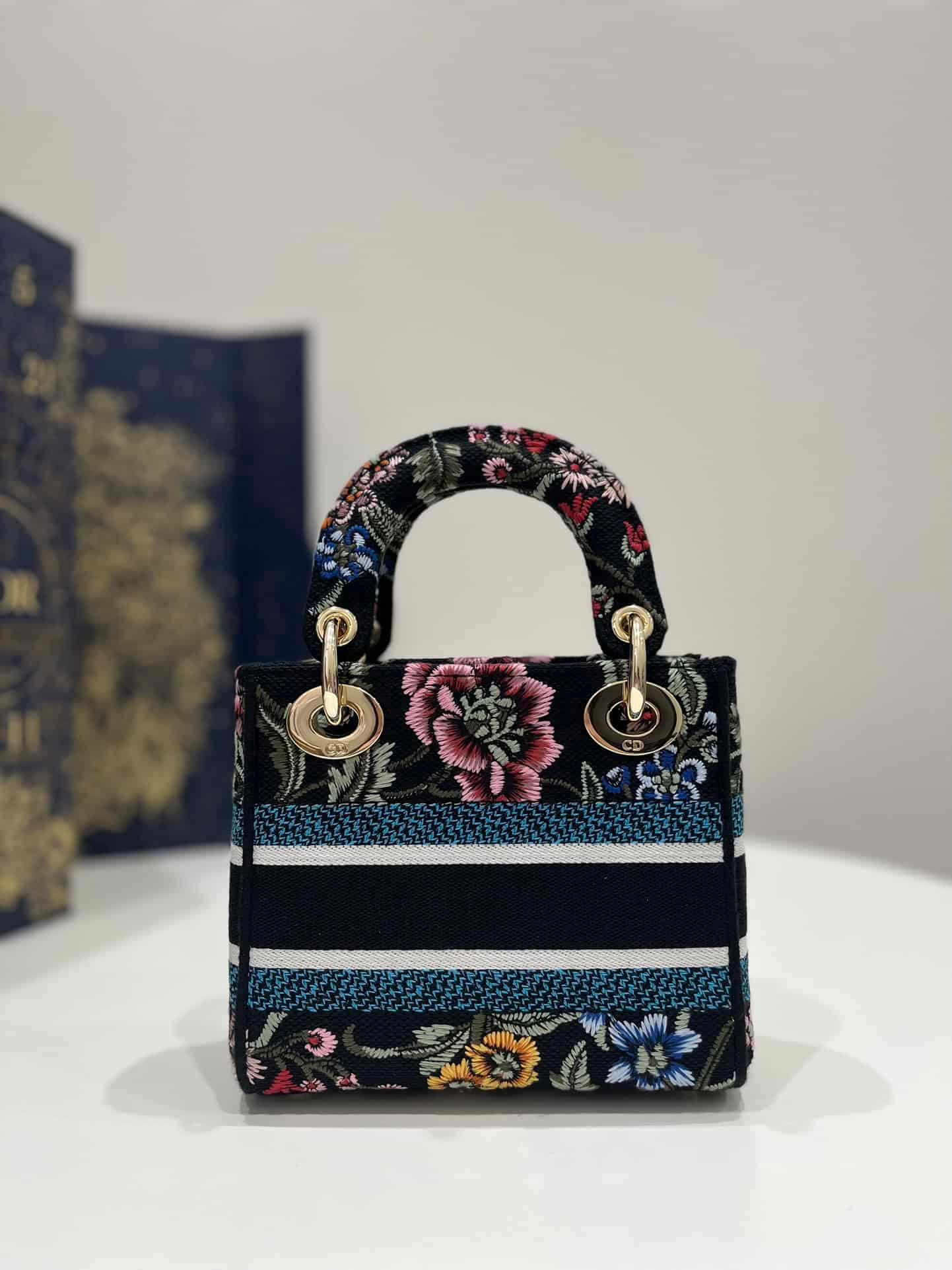 The Mini Lady D-Lite bag combines classic elegance with House modernity. The style is fully embroidered with the multicolor Dior Petites Fleurs motif, a romantic and vibrant homage to Mr. Dior’s passion for florals. A Christian Dior Paris signature adorns the front, while D.I.O.R. charms in pale gold-finish metal further enhance and highlight the silhouette. Featuring a wide embroidered shoulder strap, the miniature Lady D-Lite bag can be carried by hand, worn over the shoulder or crossbody.