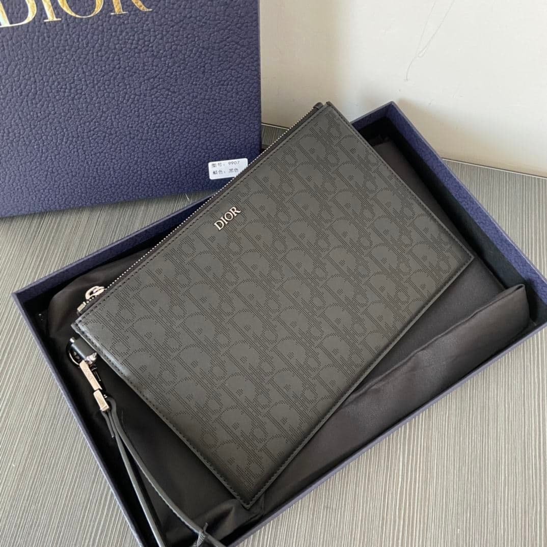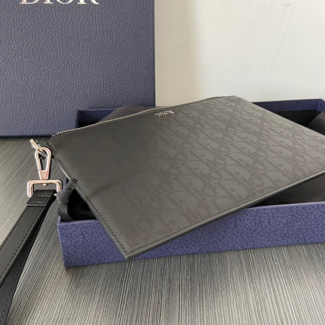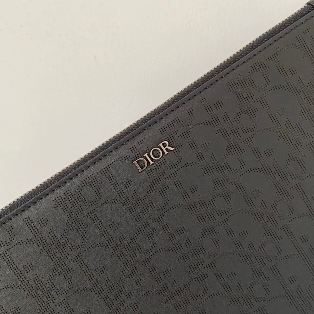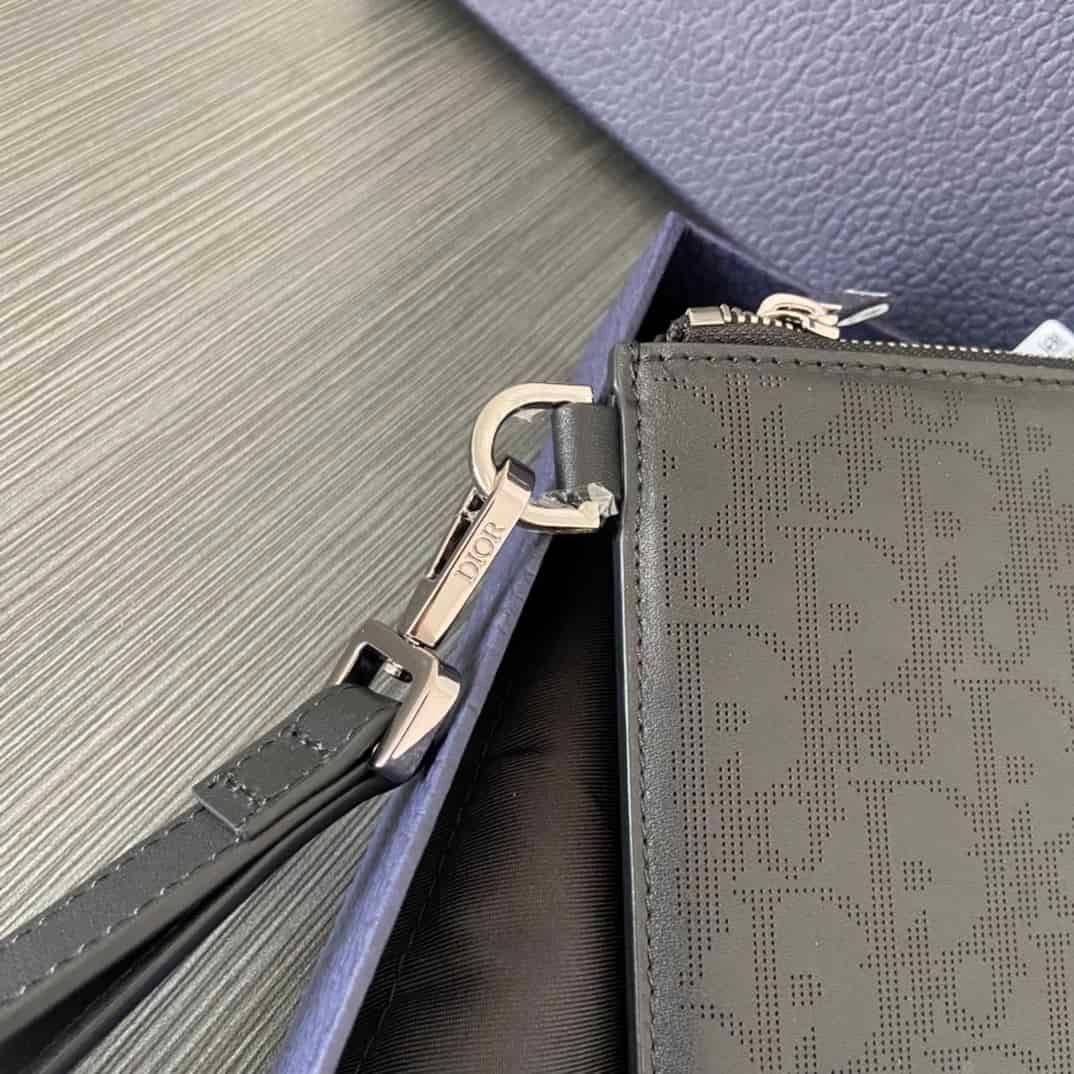 • The Oblique Galaxy A5 Pouch is an elegant accessory that demonstrates the House’s unique savoir-faire in leatherwork. It is crafted in black Dior Oblique Galaxy, a smooth perforated with the Dior Oblique motif and enhanced by a reflective lining. The pouch features a Dior signature on the front and a zipped compartment with a patch pocket that accommodates a card holder. Equipped with a removable strap, the pouch may be carried by hand or slipped into a bag.