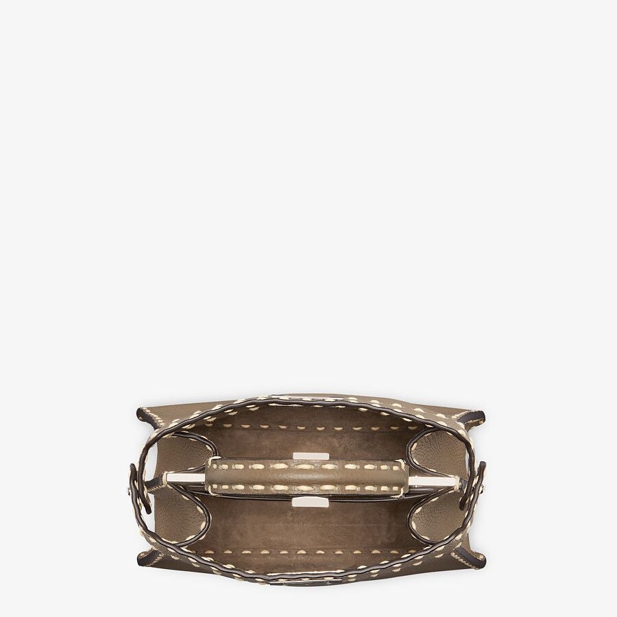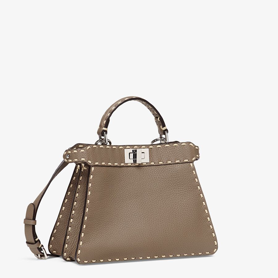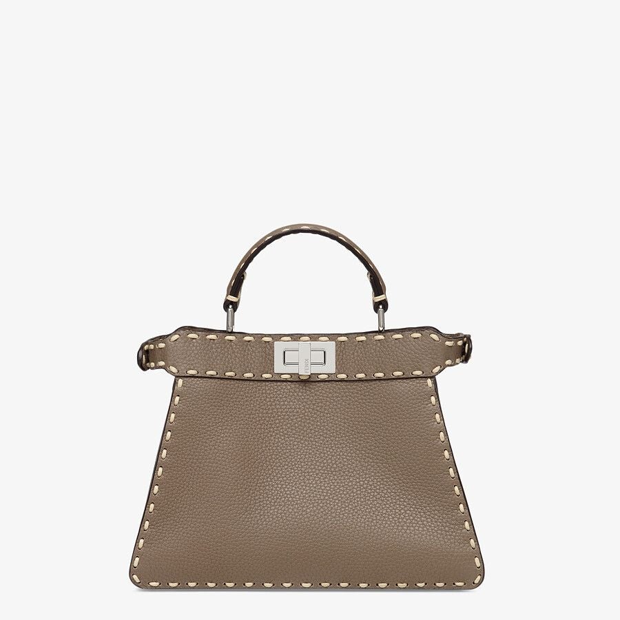 Small iconic Peekaboo I See U bag, made of gray full grain leather with oversized hand stitching and embellished with the classic twist lock on both sides.