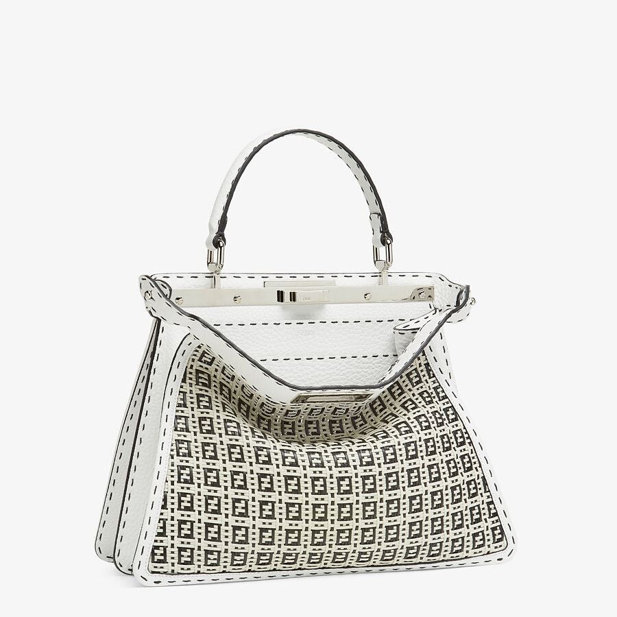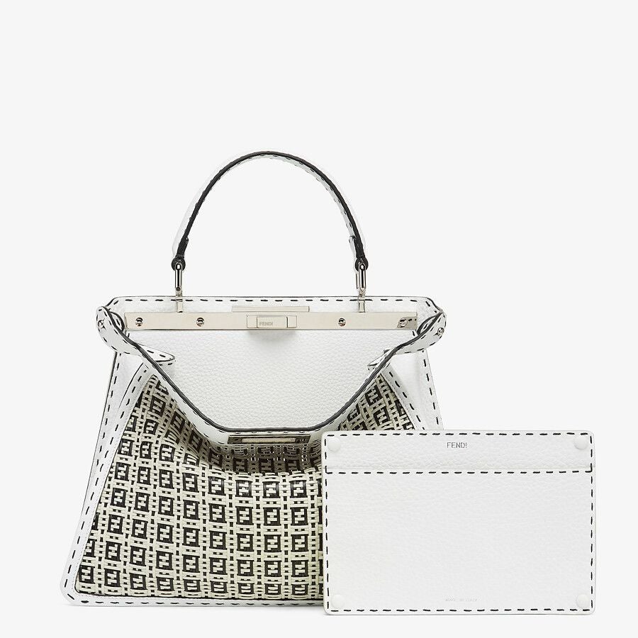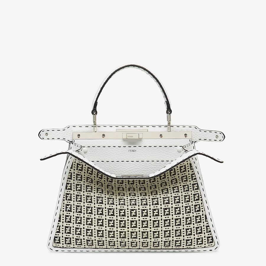 Iconic Peekaboo ISeeU bag in medium, exquisitely made using braided nappa leather and featuring the iconic FF motif in black and white. Featuring hand-stitched white Cuoio Romano leather detailing and decorated with the iconic twist lock on both sides.