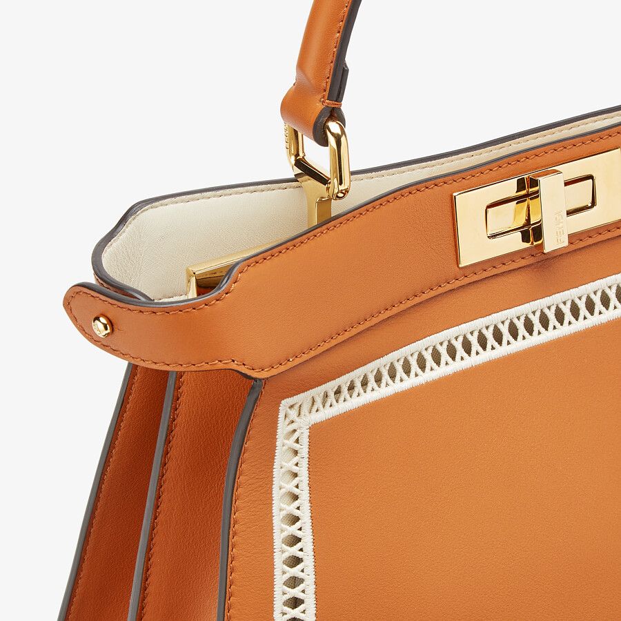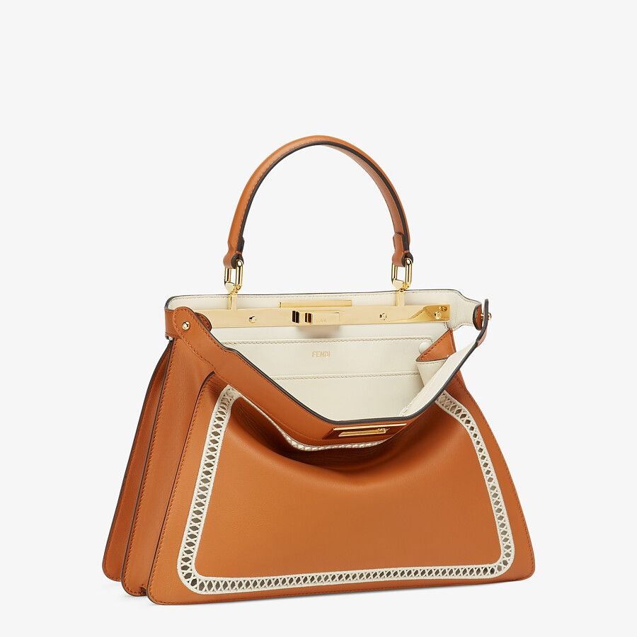 Iconic Peekaboo I See U bag in medium, made of brown-colored leather featuring white à jour embroidery and embellished with the classic twist lock on both sides.