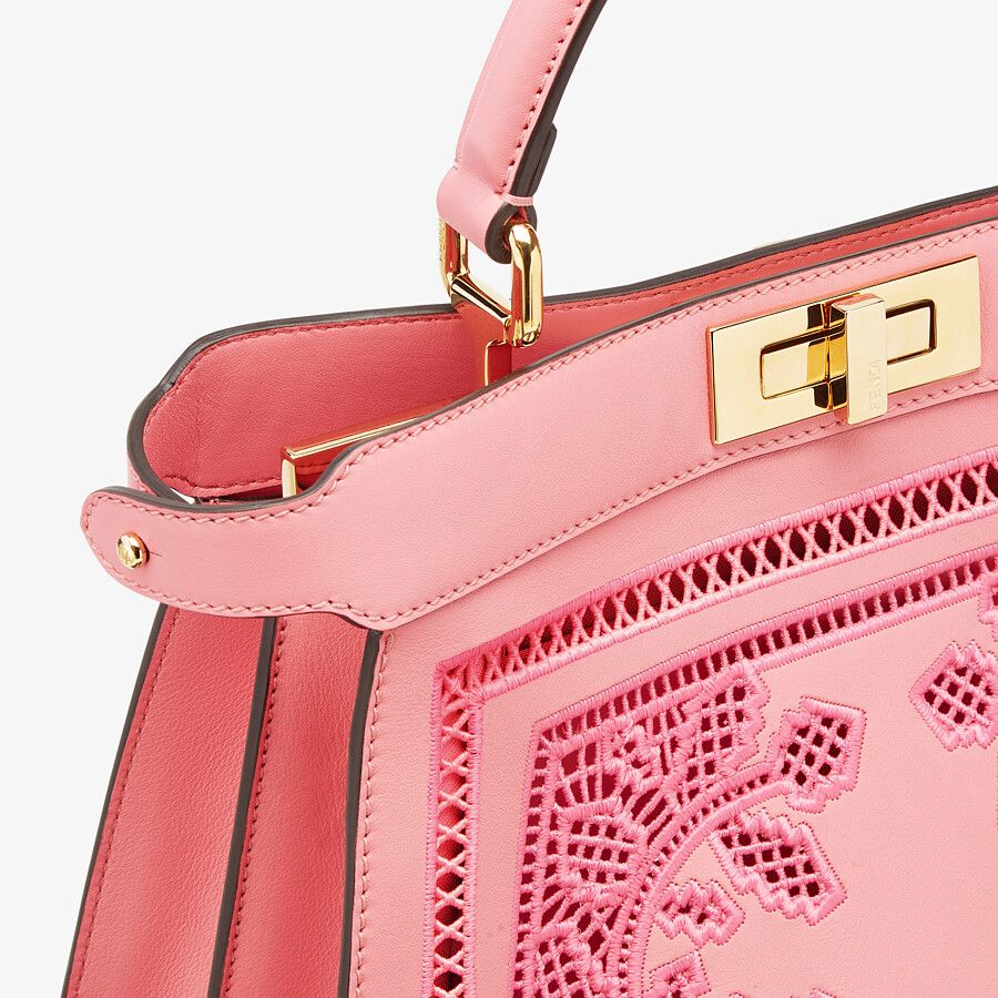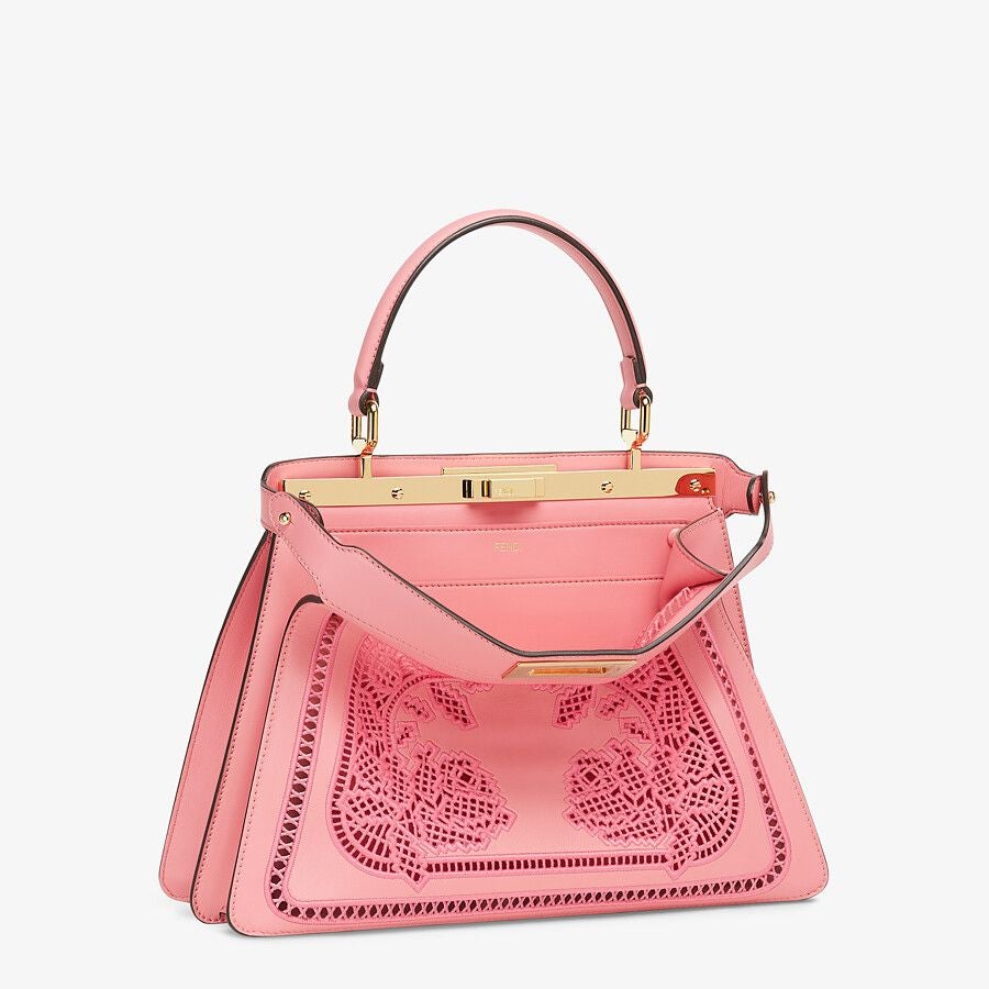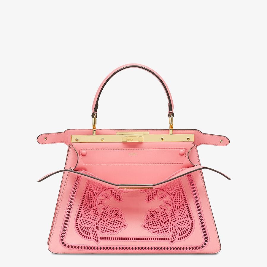 Iconic medium Peekaboo ISeeU bag made of pink leather and featuring an elegant floral motif created with tone on tone à jour embroidery. Decorated with iconic twist lock on both sides.