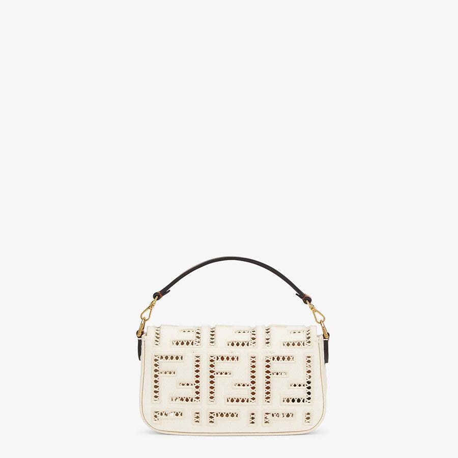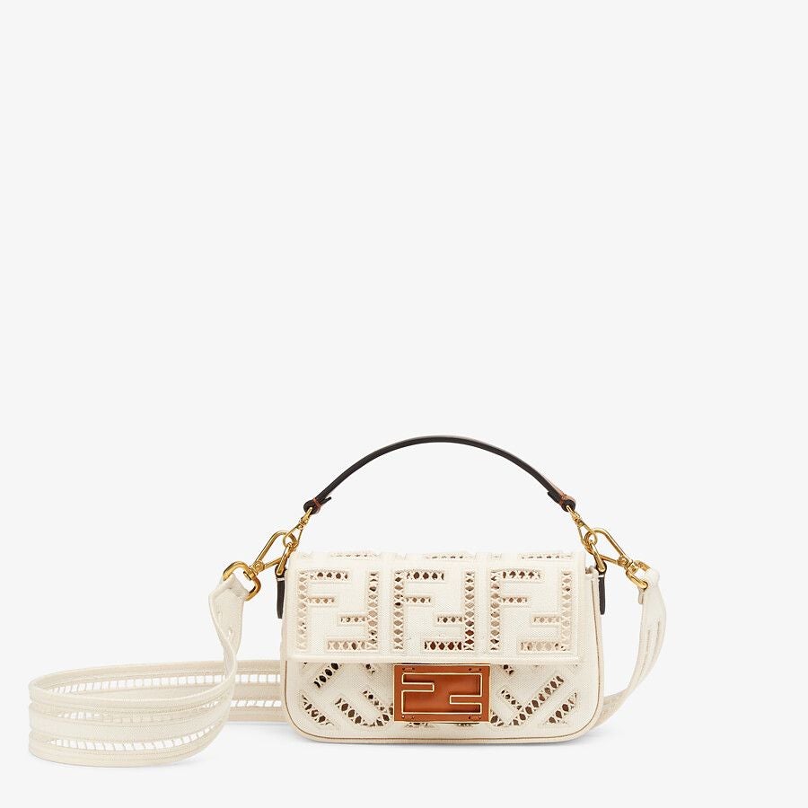 Iconic mini Baguette bag made of undyed canvas with à jour embroidered FF motif. Finished with natural leather details and embellished with an FF clasp.