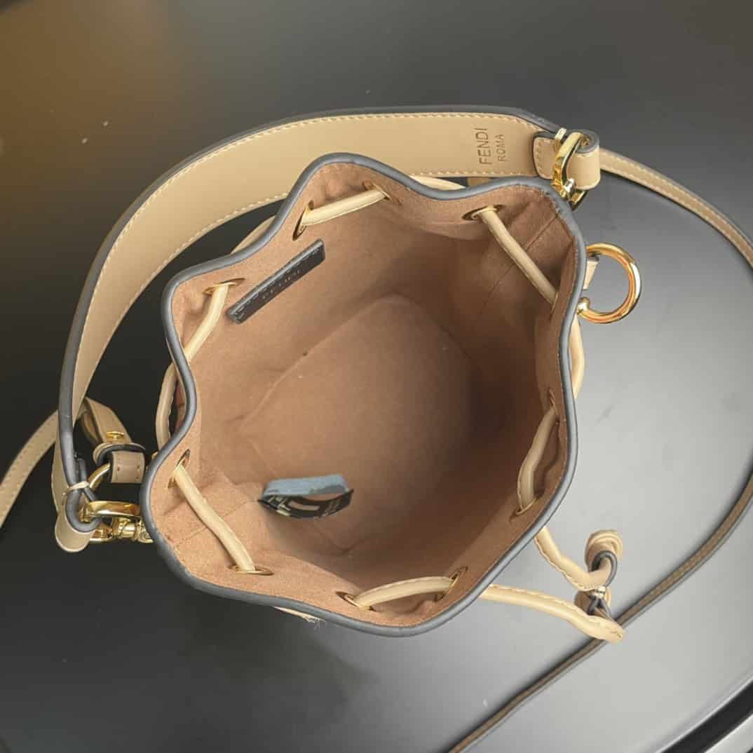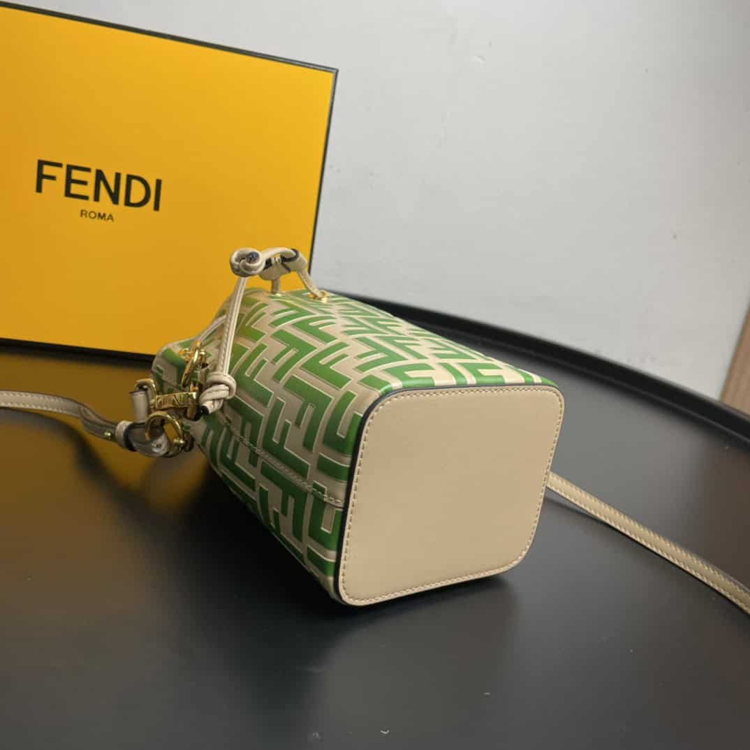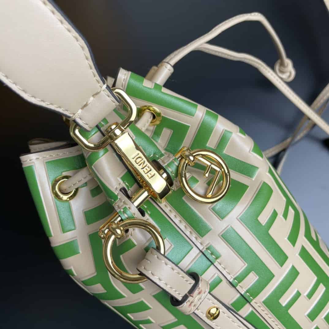 Mini Mon Tresor bucket bag with drawstring fastening and metal decorations in the Fendi logo shape. Two detachable shoulder straps, one long and one short, to carry the bag in the hand, over the shoulder or cross-body. Made of green calfskin. Iconic FF pattern printed in relief and hand-painted. Gold-finish metalware.