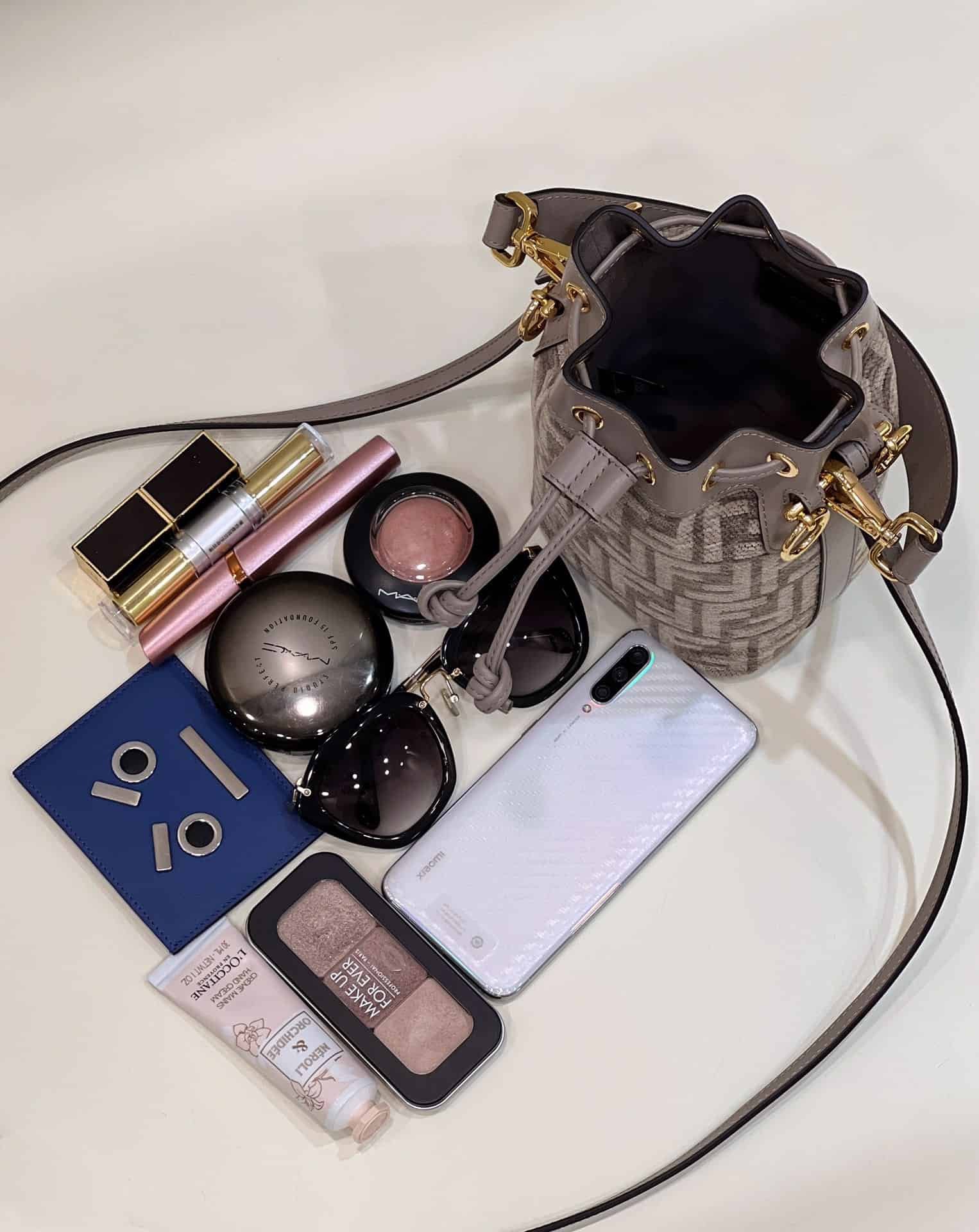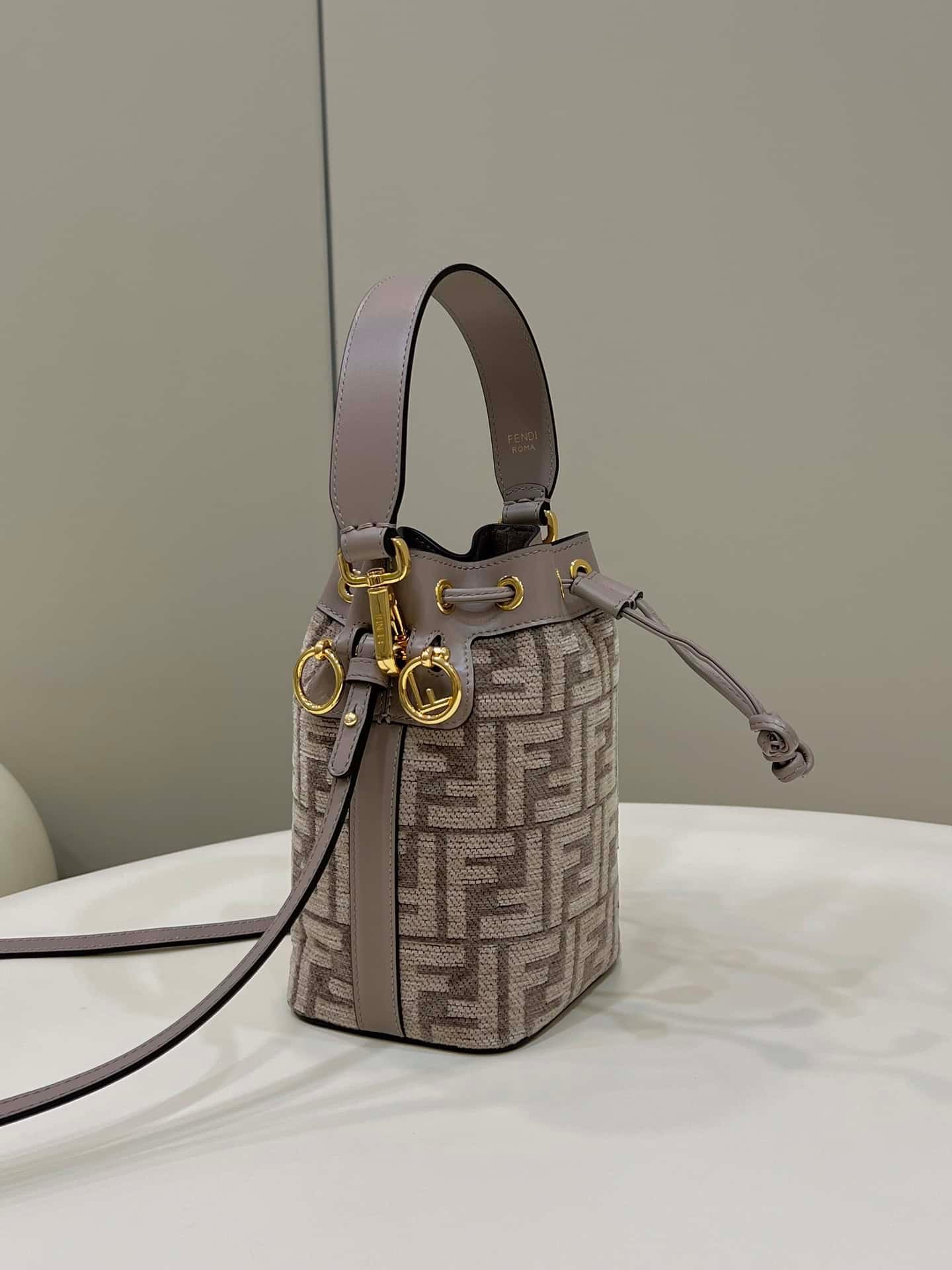 Small Mon Tresor bucket bag with drawstring fastening and metal decorations in the Fendi logo shape. Two detachable shoulder straps, one long and one short, to wear the bag over the shoulder or cross-body. Made of beige leather. Finished with embossed FF motif print and hand painted in pink. Gold-finish metalware.