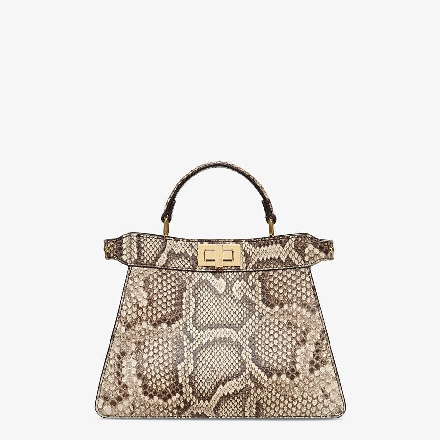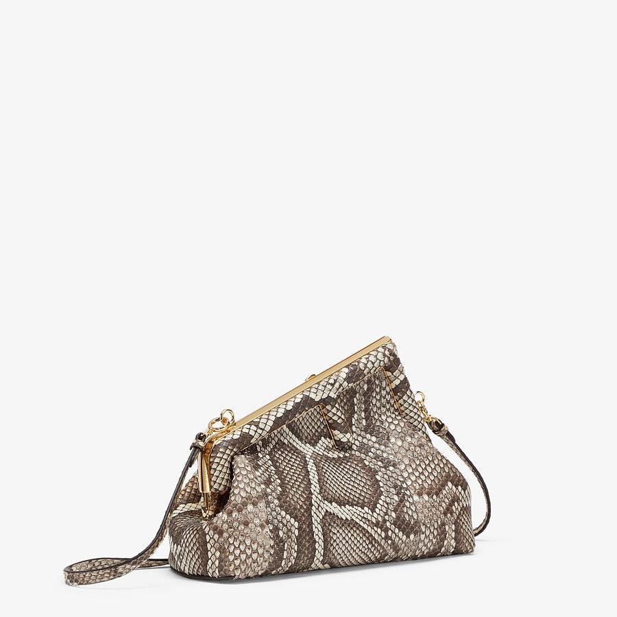 Small Fendi First bag made of exquisite natural-colored python leather. Decorated with an F-shaped snap clasp covered in tone on tone python leather.