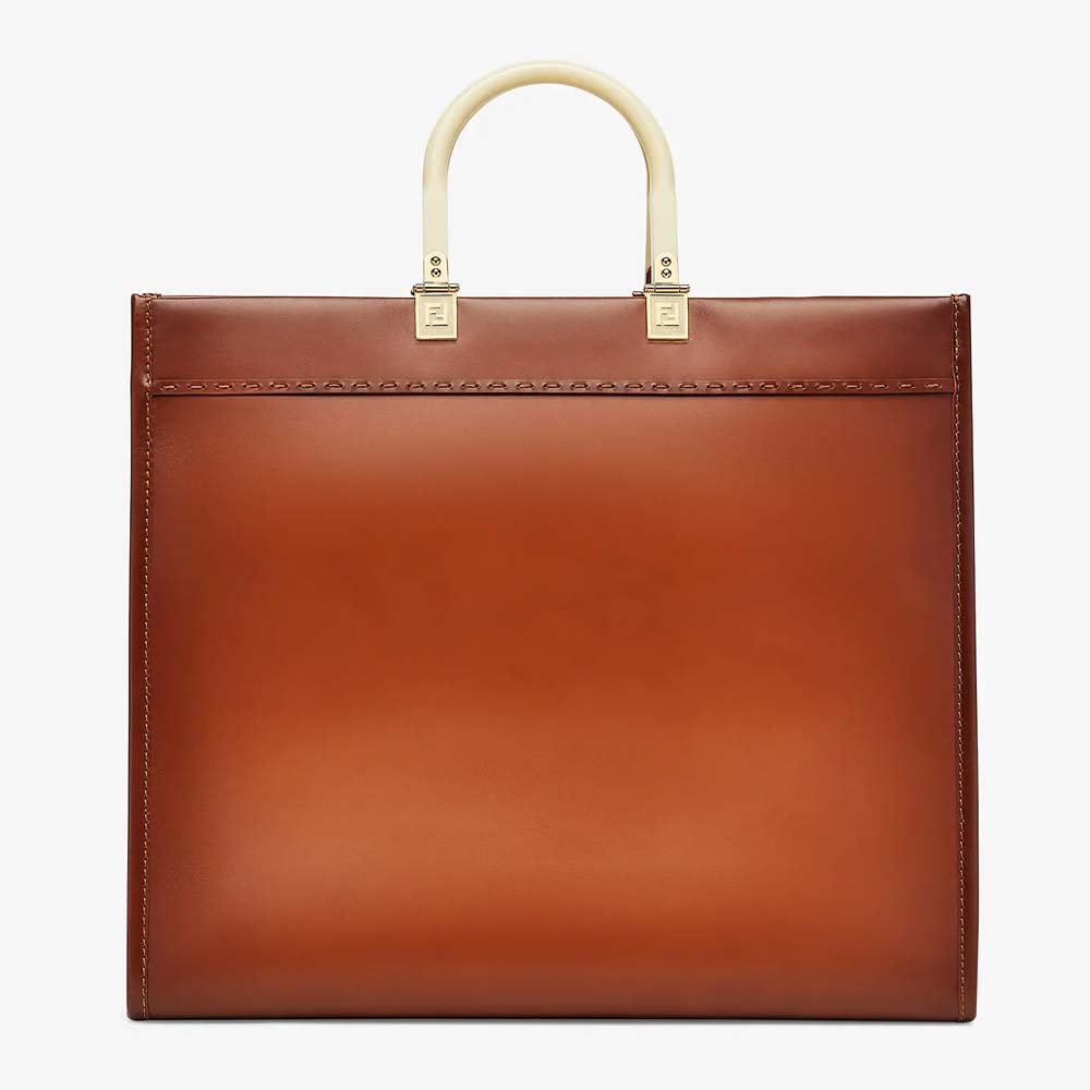 Sunshine Shopper bag made of leather elegantly hand-decorated in graduated shades of brown, with hot-stamped âFENDI ROMAâ and stiff white plexiglass handles.