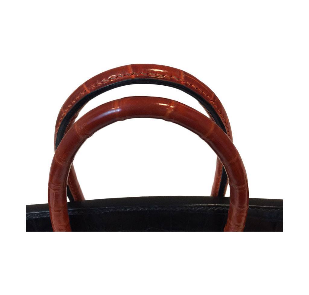 Extremely rare Hermès Birkin limited edition bi-color crocodile bag. Combination of black and Hermès signature orange on a two-tone crocodile exterior. The embossing features the dual-dot signature, which signifies Niloticus Crocodile from the Nile River. Palladium hardware completes the elegant appearance on one of the rarest Birkin bags we have ever featured on Baghunter. Please contact us for more details and availability.