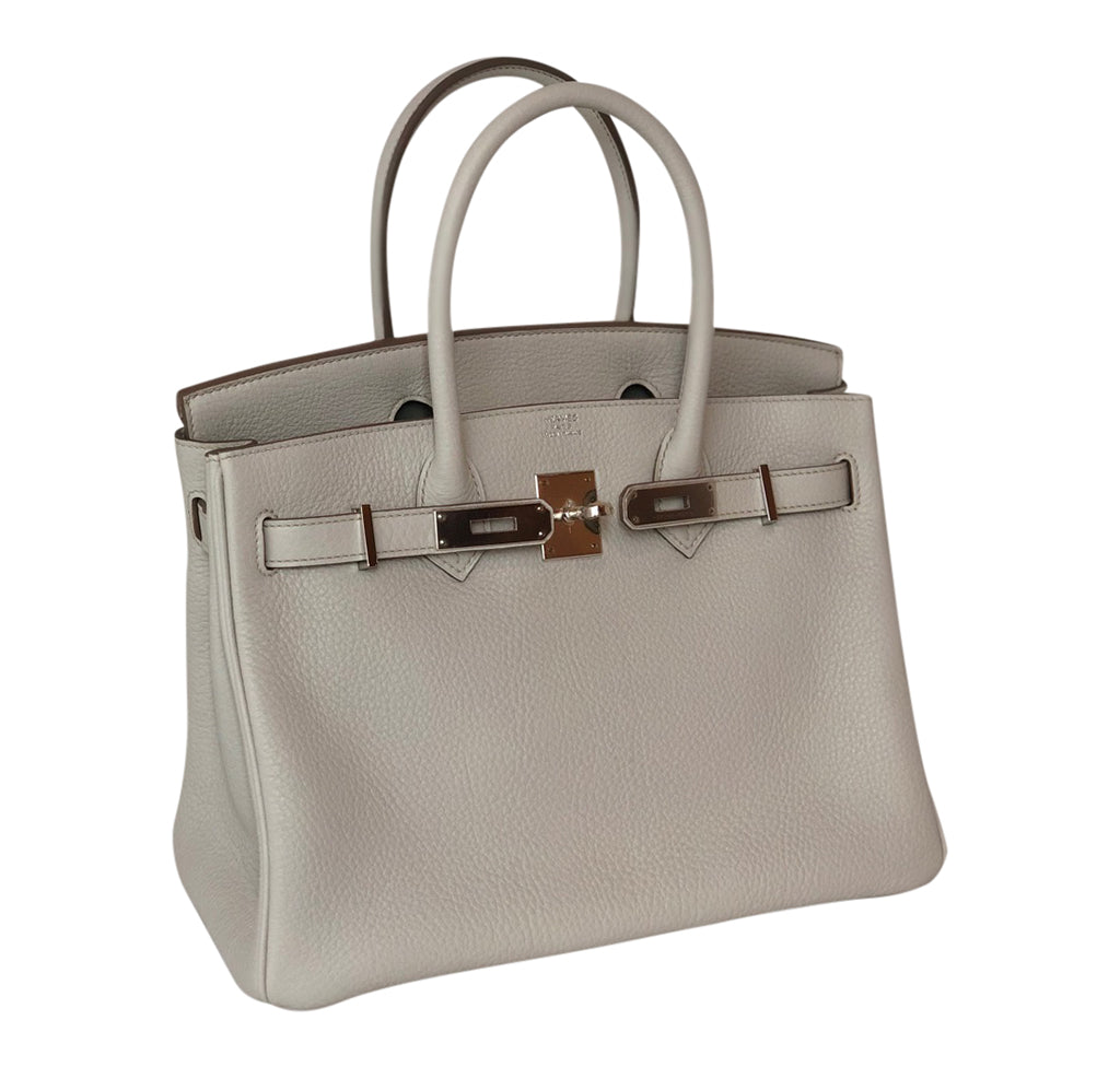 This classic Hermès Birkin 30cm bag is crafted from lightweight Togo leather, one of the most popular in the Hermès repertoire. Featuring a light grey, Gris Perle color, this bag is finished with Palladium hardware on the clasp, studs, and lock for a truly vintage appearance. This store-fresh Birkin comes with a complete set of original accessories.