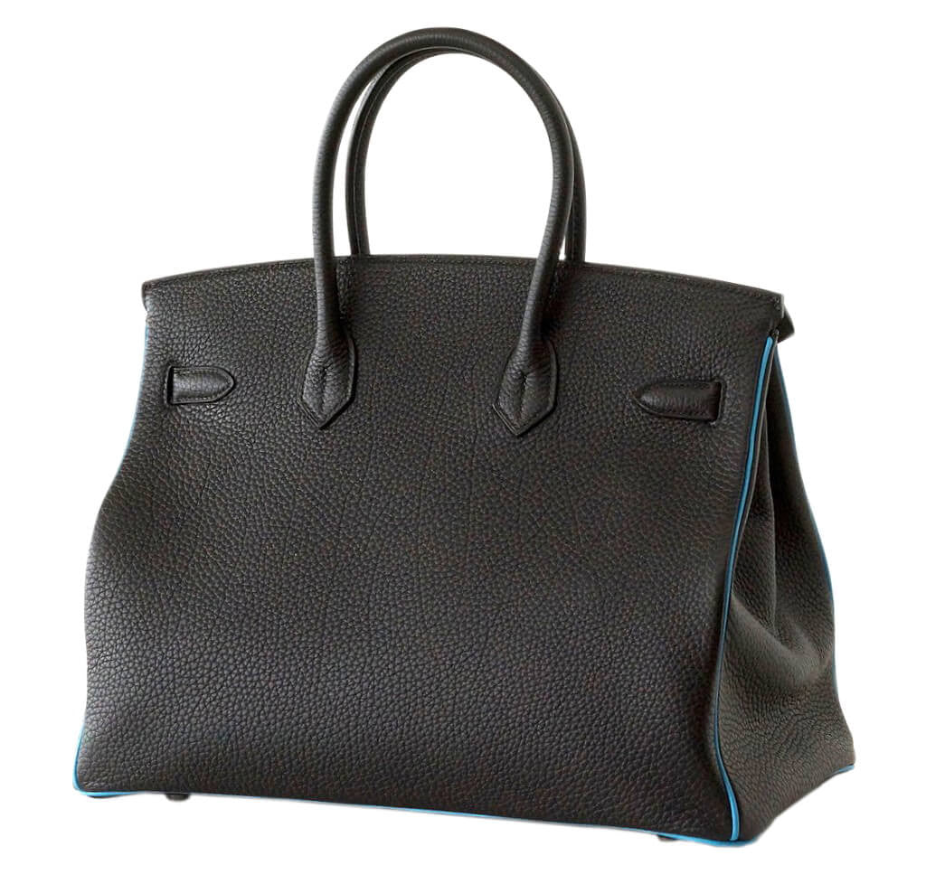 This Hermès Birkin Special Order Horseshoe bag in size 35cm is one of a kind. This bag features a Jet Black exterior and a Turquoise interior. This Birkin bag is made from soft Togo leather and is accentuated by brushed palladium hardware. The horseshoe signature is located next to the “Made in France” embossing, which is added to all special order Hermès bags. This bag is store-fresh and has never been carried.