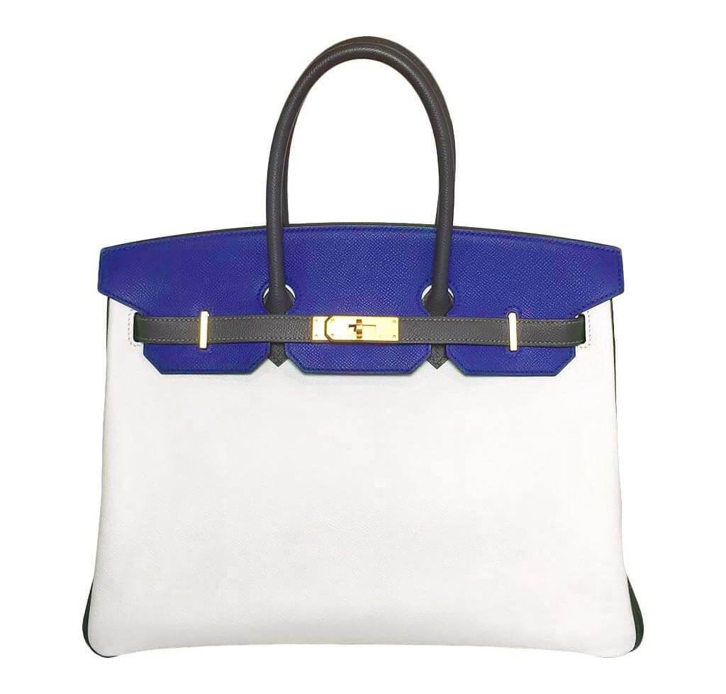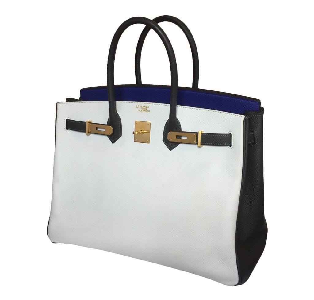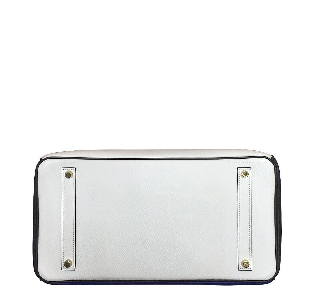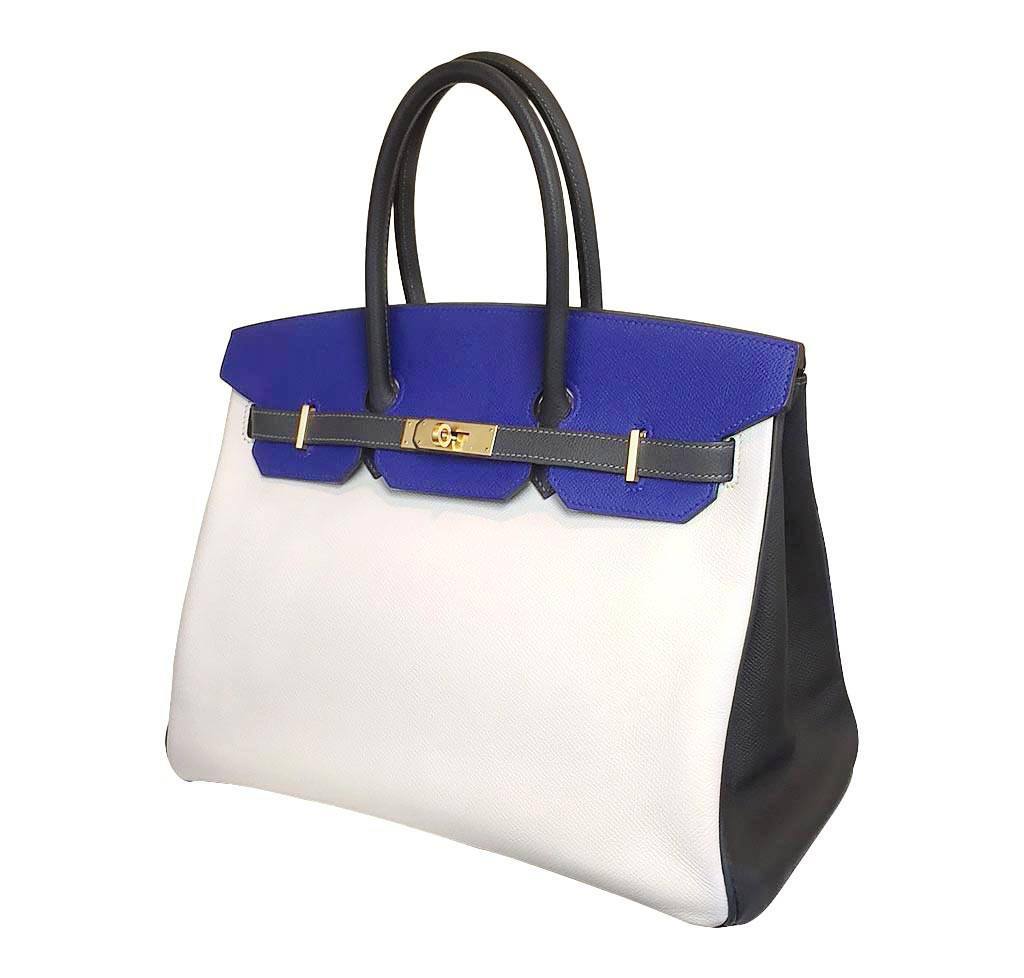 This Hermès Birkin special order 35cm bag is extremely rare and limited. The exterior of this bag is made from Epsom leather and is featured in white, graphite and blue electric. There is a horseshoe icon next to the embossing, which is added to all special order Hermes bags. The stamp is âPâ in a square, which denotes 2012 as the year of production and the hardware is brushed gold. This Special Order Birkin bag has only had one owner and is being sold for the first time.