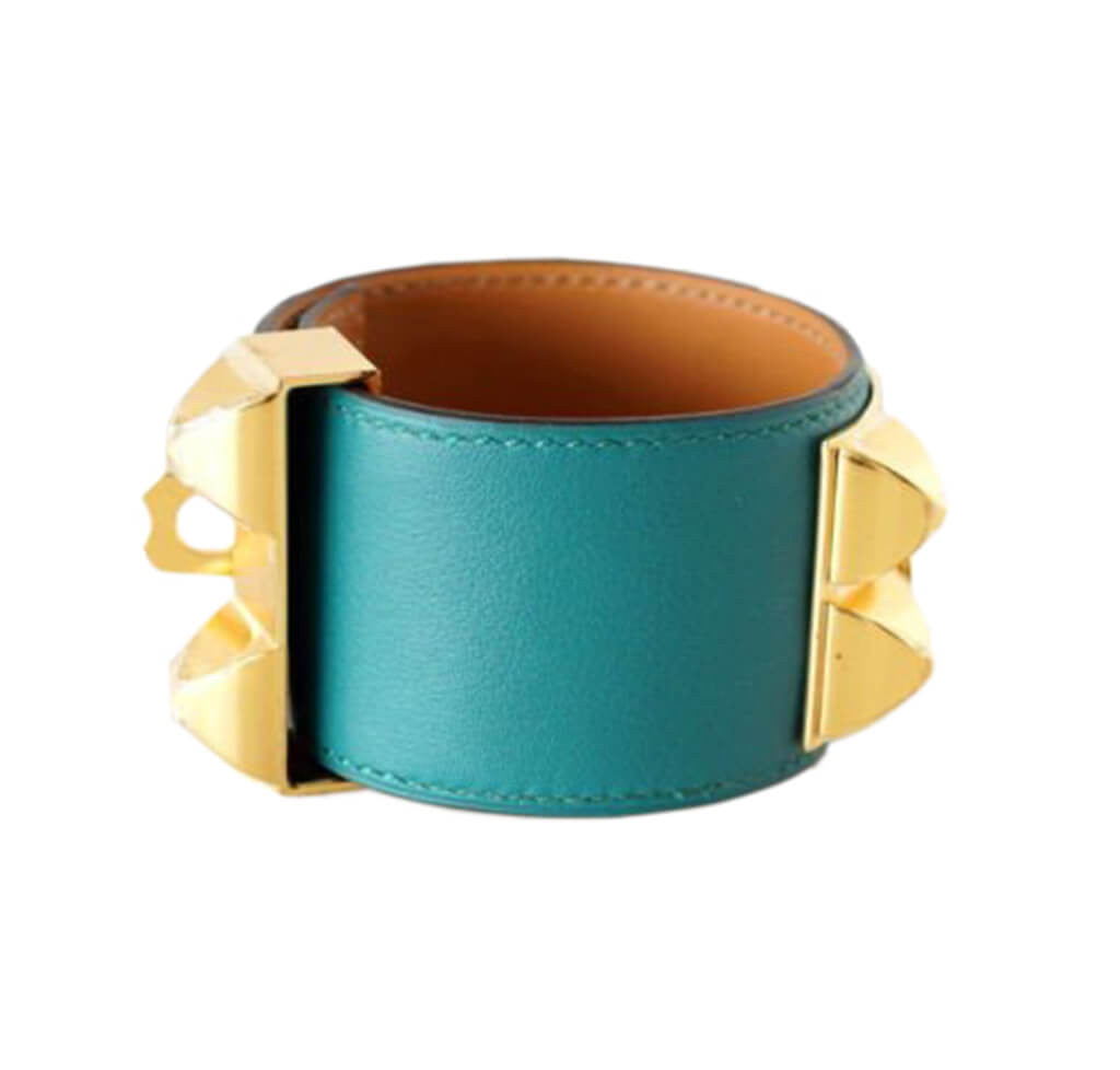 This Hermès Collier de Chien bracelet is featured in Malachite, which is a stunning green tone. The calfskin leather is incredibly smooth and is accentuated by gold hardware. The stamp on this store fresh Hermès bracelet is “Q” in a square, denoting 2013 as the year of production. This size small Hermès CDC bracelet is incredibly rare and has never been worn.
