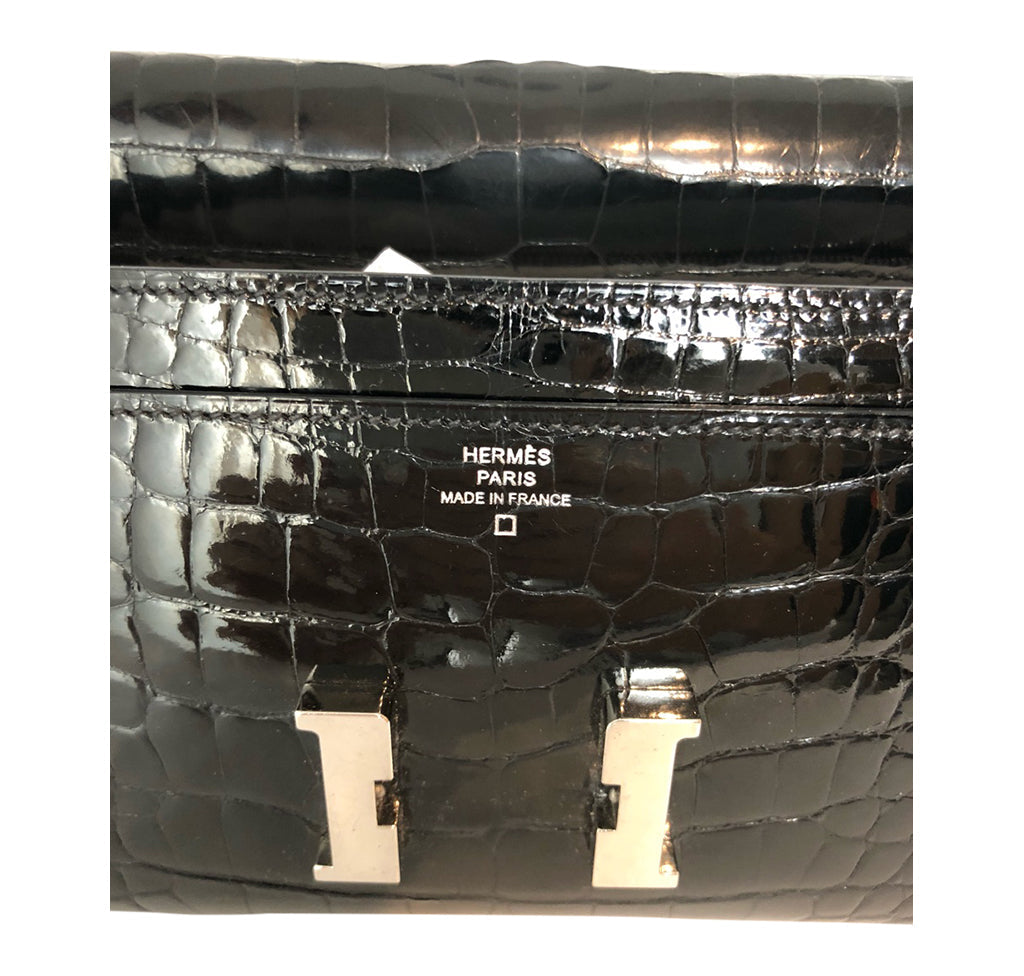 This rare Hermès Constance Long Wallet/Clutch is crafted from Lisse Alligator skin, as evidenced by the square stamp underneath the “Hermes Paris” embossing. This Mississippi Alligator leather is extremely rare and looks stunning in combination with the Noir color and Gold hardware. The famous “H” closure is the centerpiece for this long wallet version of the Constance bag.