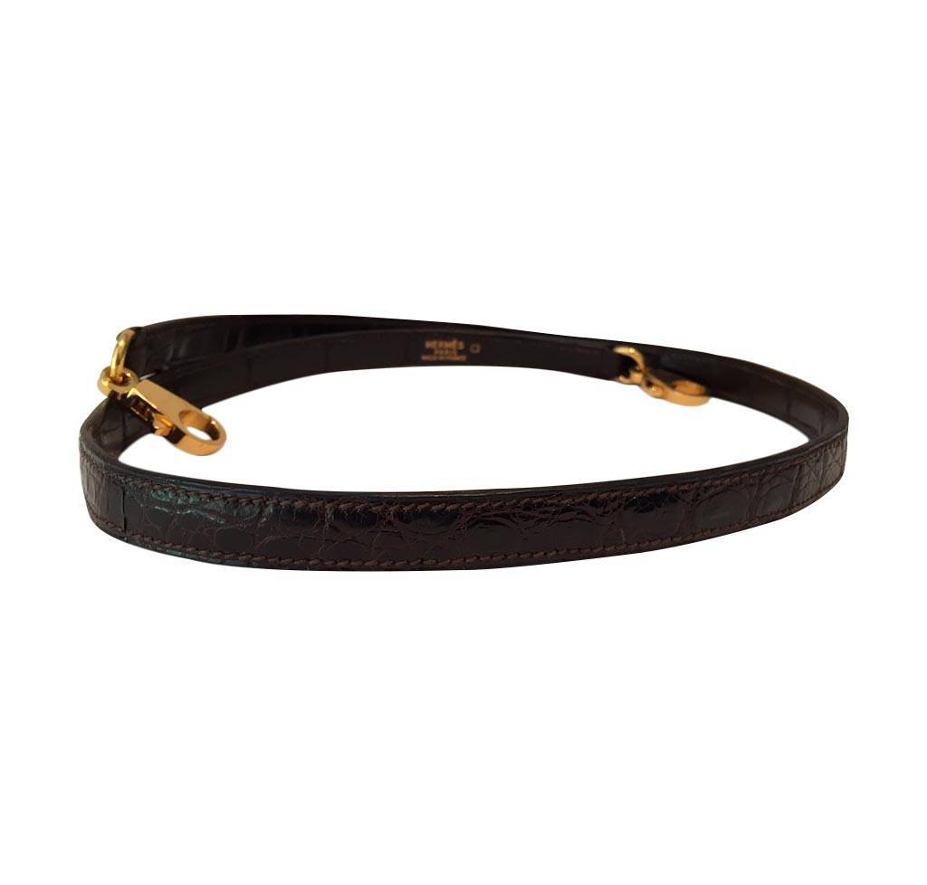 This Hermès Kelly 28cm bag is made from exotic alligator skin, which is identified by the square symbol next the to embossing. This bag is featured in Graphite, which is a dark grey, almost black. This Kelly bag is accentuated by gold hardware and comes with all of the original accessories.