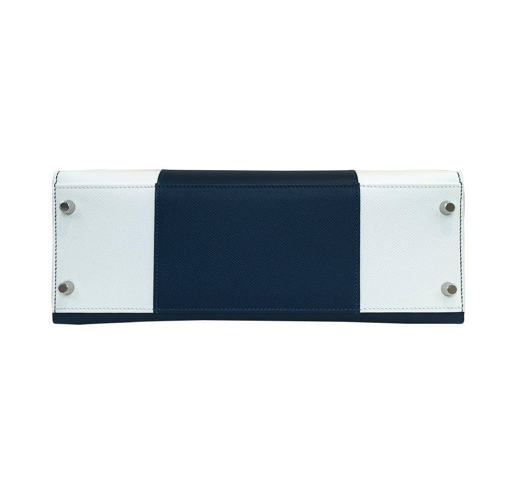 Treat yourself to this amazing Hermès Kelly Flag Sellier bag in size 32. This limited edition Kelly bag is super rare and nearly impossible to find anywhere else. Featured in White and in Blue Thalassa, this bag stands out, yet remains easy to coordinate with any outfit to perfection. This bag is made from nearly scratch resistant Epsom leather and is accentuated with palladium hardware. Don’t miss out on this gorgeous Kelly Flag Sellier by Hermès and watch as heads spin everywhere you go.